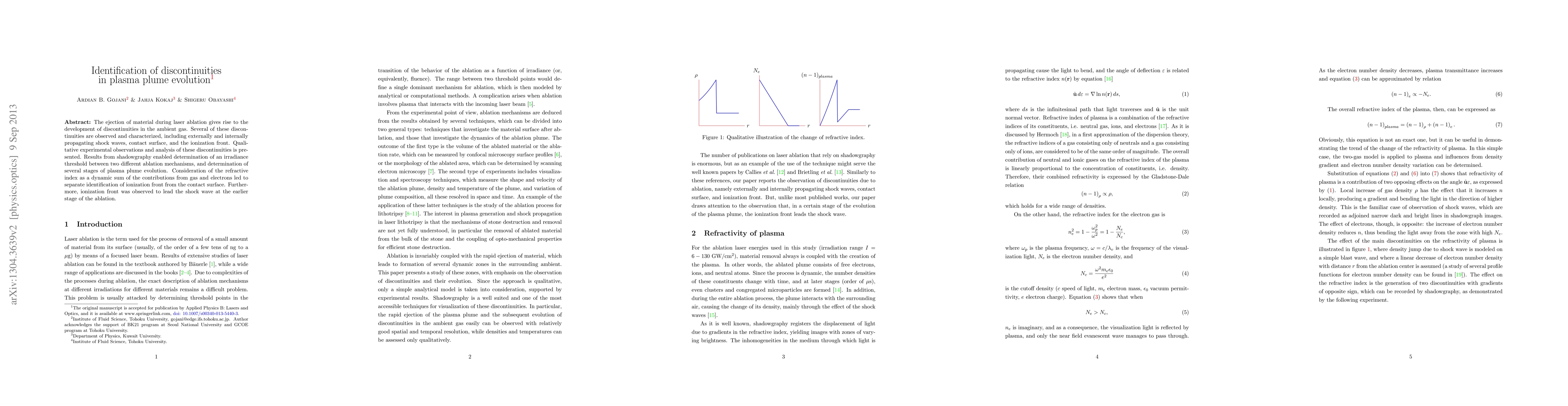 This study identifies and characterizes discontinuities in plasma plume evolution during laser ablation, including shock waves, contact surfaces, and ionization fronts. Experimental observations using shadowgraphy reveal an irradiance threshold distinguishing different ablation mechanisms, and stages of plasma plume development, with the ionization front preceding the shock wave.