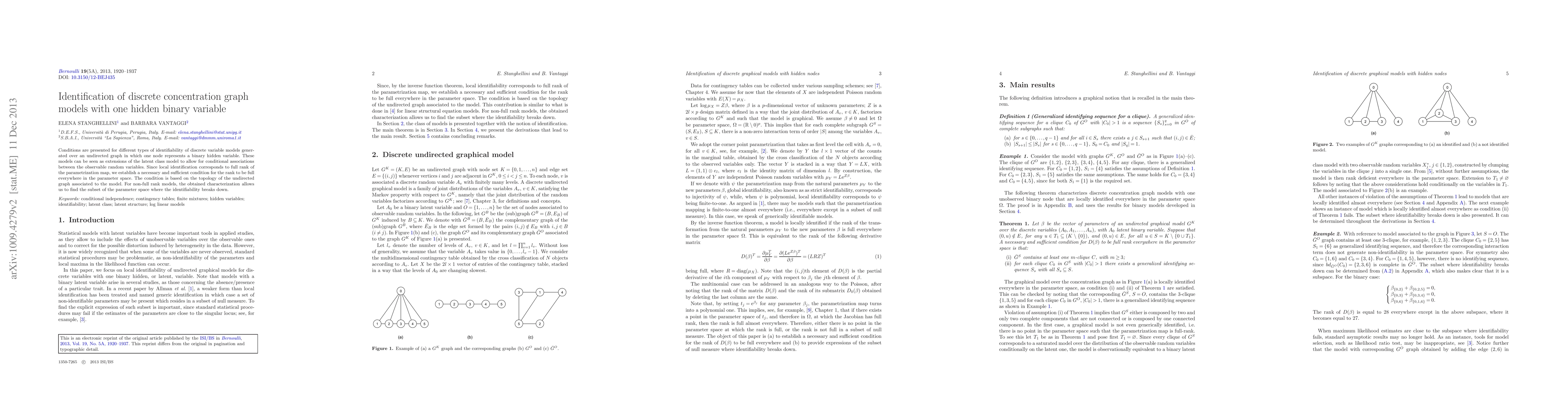 Conditions are presented for different types of identifiability of discrete variable models generated over an undirected graph in which one node represents a binary hidden variable. These models can be seen as extensions of the latent class model to allow for conditional associations between the observable random variables. Since local identification corresponds to full rank of the parametrization map, we establish a necessary and sufficient condition for the rank to be full everywhere in the parameter space. The condition is based on the topology of the undirected graph associated to the model. For non-full rank models, the obtained characterization allows us to find the subset of the parameter space where the identifiability breaks down.