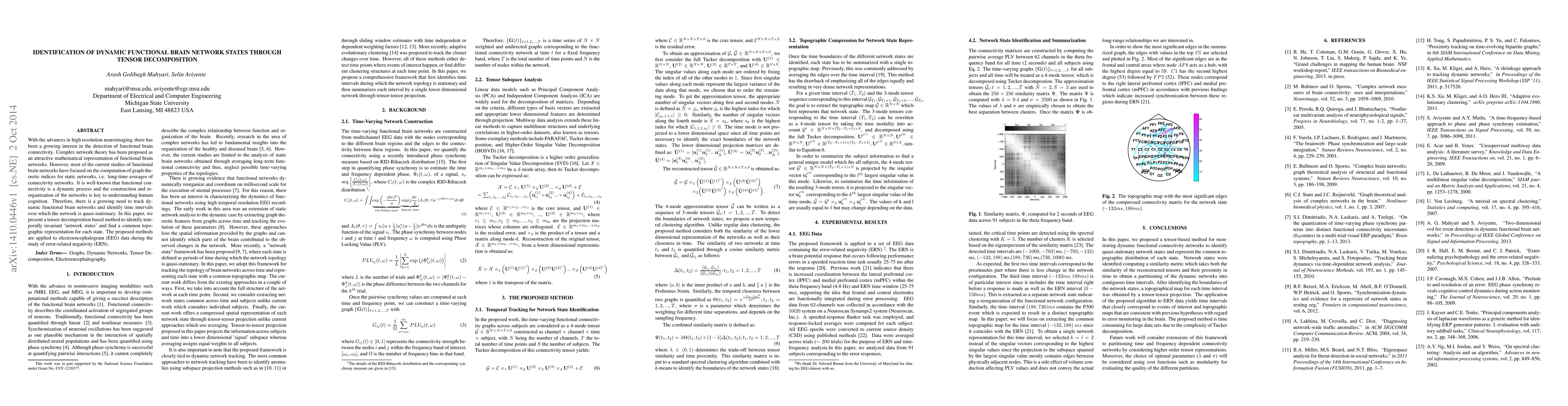 This paper proposes a tensor decomposition method to identify dynamic functional brain network states, focusing on temporally invariant network states and their common topographic representations. The method is applied to EEG data to study error-related negativity, highlighting the dynamic nature of functional connectivity.