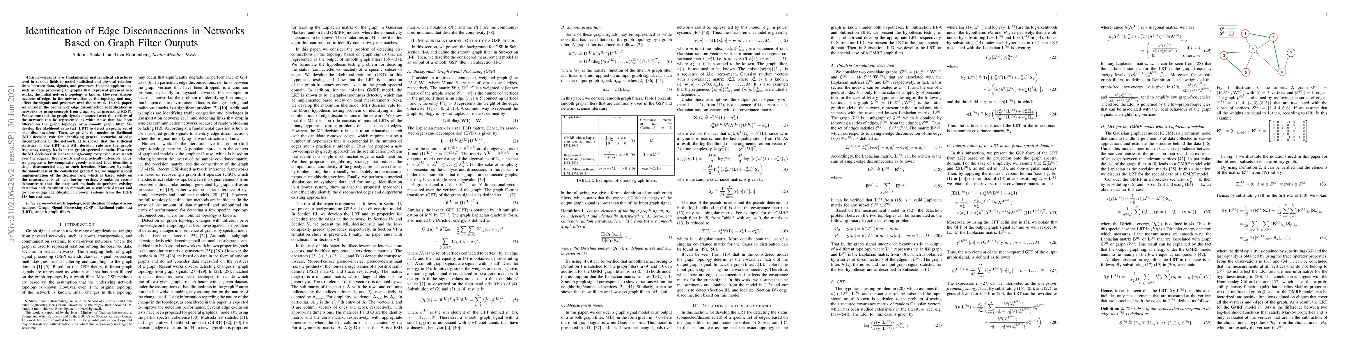 This research introduces a method using graph signal processing to identify edge disconnections in networks, proposing a low-complexity greedy algorithm for single edge identification. Simulation results show its effectiveness compared to existing methods in synthetic datasets and IEEE 118-bus power system test cases.