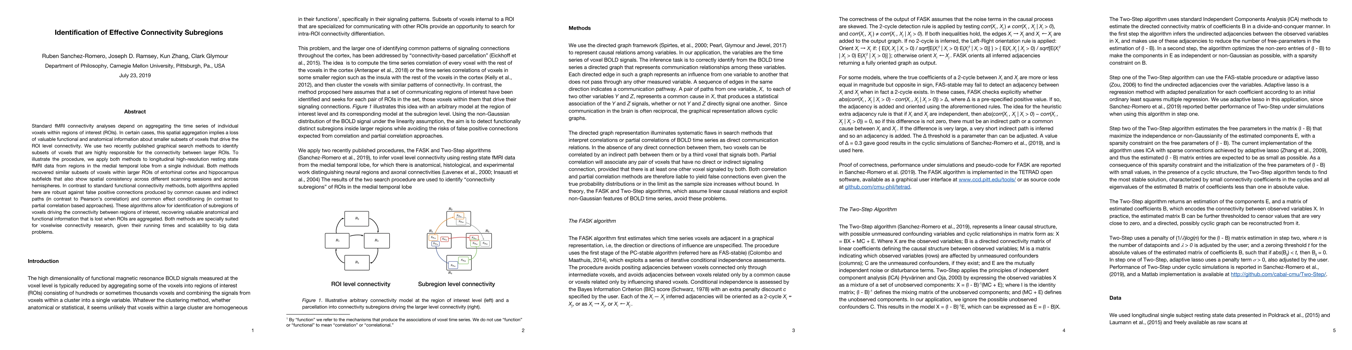 Standard fMRI connectivity analyses depend on aggregating the time series of individual voxels within regions of interest (ROIs). In certain cases, this spatial aggregation implies a loss of valuable functional and anatomical information about smaller subsets of voxels that drive the ROI level connectivity. We use two recently published graphical search methods to identify subsets of voxels that are highly responsible for the connectivity between larger ROIs. To illustrate the procedure, we apply both methods to longitudinal high-resolution resting state fMRI data from regions in the medial temporal lobe from a single individual. Both methods recovered similar subsets of voxels within larger ROIs of entorhinal cortex and hippocampus subfields that also show spatial consistency across different scanning sessions and across hemispheres. In contrast to standard functional connectivity methods, both algorithms applied here are robust against false positive connections produced by common causes and indirect paths (in contrast to Pearson's correlation) and common effect conditioning (in contrast to partial correlation based approaches). These algorithms allow for identification of subregions of voxels driving the connectivity between regions of interest, recovering valuable anatomical and functional information that is lost when ROIs are aggregated. Both methods are specially suited for voxelwise connectivity research, given their running times and scalability to big data problems.