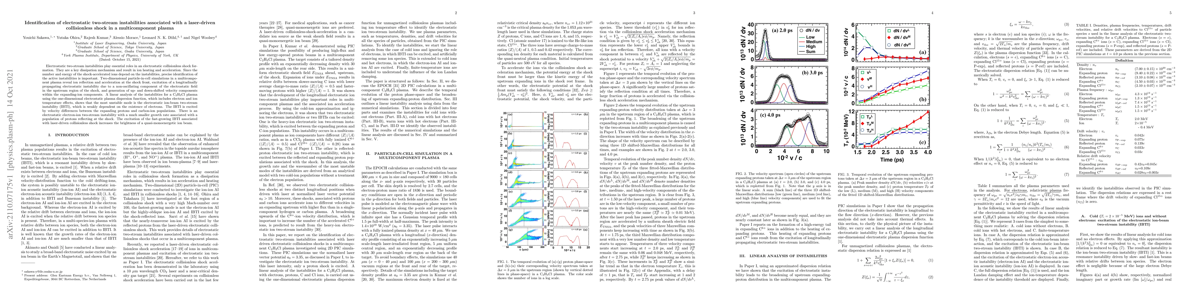 This paper identifies electrostatic two-stream instabilities in laser-driven collisionless shocks within a multicomponent plasma, revealing significant ion heating and acceleration mechanisms. The study highlights the electrostatic ion-beam two-stream instability (IBTI) as the most unstable mode, driven by velocity differences between proton and carbon-ion populations, enhancing the brightness of a quasi-monoenergetic ion beam.
