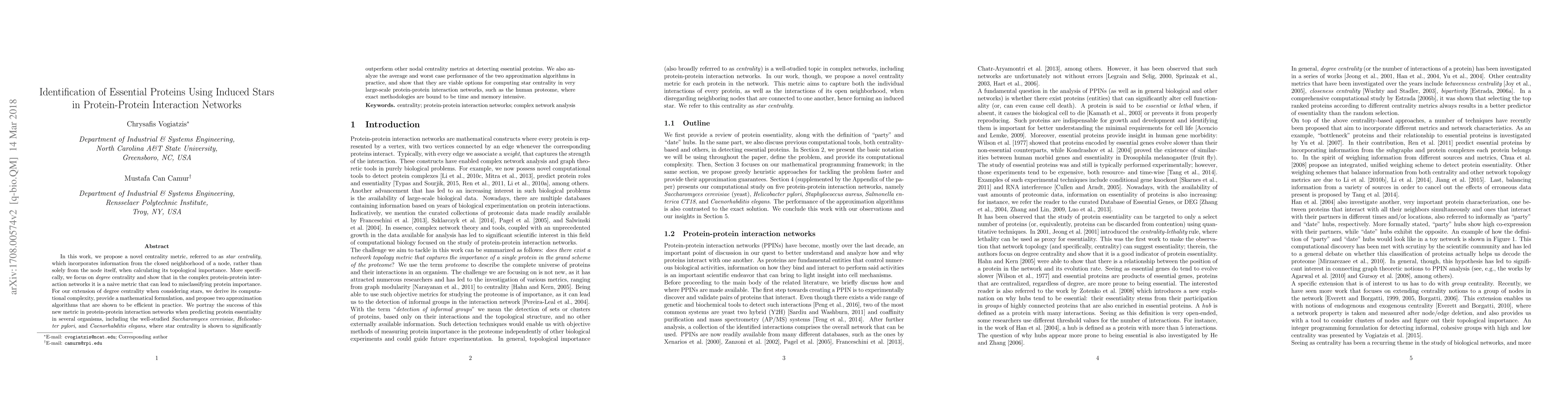 In this work, we propose a novel centrality metric, referred to as star centrality, which incorporates information from the closed neighborhood of a node, rather than solely from the node itself, when calculating its topological importance. More specifically, we focus on degree centrality and show that in the complex protein-protein interaction networks it is a naive metric that can lead to misclassifying protein importance. For our extension of degree centrality when considering stars, we derive its computational complexity, provide a mathematical formulation, and propose two approximation algorithms that are shown to be efficient in practice. We portray the success of this new metric in protein-protein interaction networks when predicting protein essentiality in several organisms, including the well-studied Saccharomyces cerevisiae, Helicobacter pylori, and Caenorhabditis elegans, where star centrality is shown to significantly outperform other nodal centrality metrics at detecting essential proteins. We also analyze the average and worst case performance of the two approximation algorithms in practice, and show that they are viable options for computing star centrality in very large-scale protein-protein interaction networks, such as the human proteome, where exact methodologies are bound to be time and memory intensive.