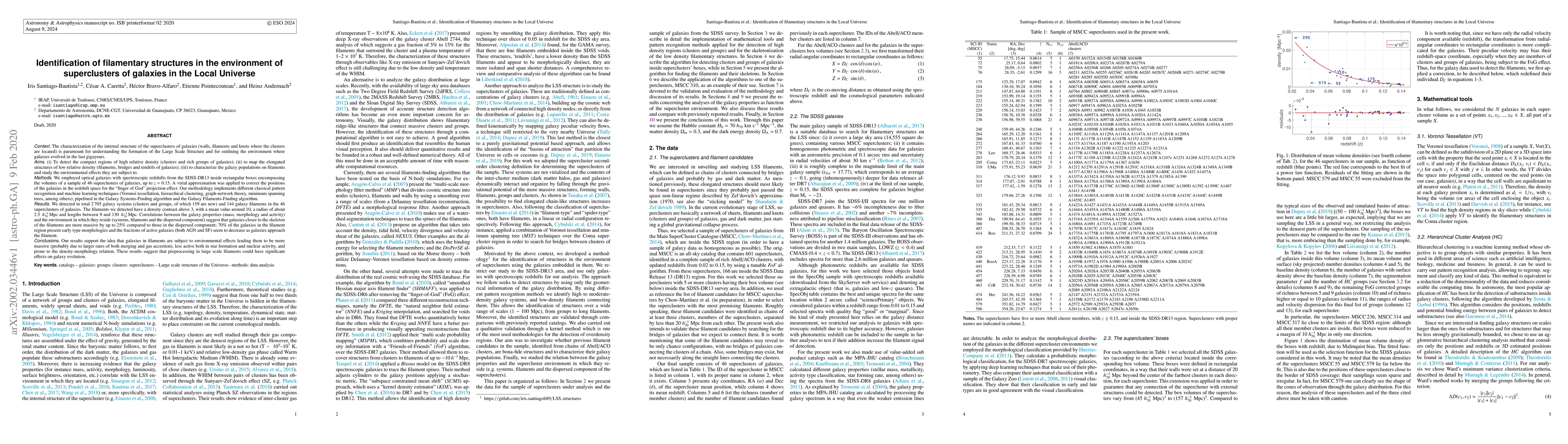 The characterization of the internal structure of the superclusters of galaxies (walls, filaments and knots where the clusters are located) is paramount for understanding the formation of the Large Scale Structure and for outlining the environment where galaxies evolved in the last Gyr. (i) To detect the compact regions of high relative density (clusters and rich groups of galaxies); (ii) to map the elongated structures of low relative density (filaments, bridges and tendrils of galaxies); (iii) to characterize the galaxy populations on filaments and study the environmental effects they are subject to. We employed optical galaxies with spectroscopic redshifts from the SDSS-DR13 inside rectangular boxes encompassing the volumes of a sample of 46 superclusters of galaxies, up to z=0.15. Our methodology implements different classical pattern recognition and machine learning techniques pipelined in the Galaxy Systems-Finding algorithm and the Galaxy Filaments-Finding algorithm. We detected in total 2,705 galaxy systems (clusters and groups, of which 159 are new) and 144 galaxy filaments in the 46 superclusters of galaxies. The filaments we detected have a density contrast above 3, with a mean value around 10, a radius of about 2.5 Mpc and lengths between 9 and 130 Mpc. Correlations between the galaxy properties (mass, morphology and activity) and the environment in which they reside (systems, filaments and the dispersed component) suggest that galaxies closer to the skeleton of the filaments are more massive by up to 25% compared to those in the dispersed component; 70 % of the galaxies in the filament region present early type morphologies and the fractions of active galaxies (both AGN and SF) seem to decrease as galaxies approach the filament. These results suggest that preprocessing in large scale filaments could have significant effects on galaxy evolution.