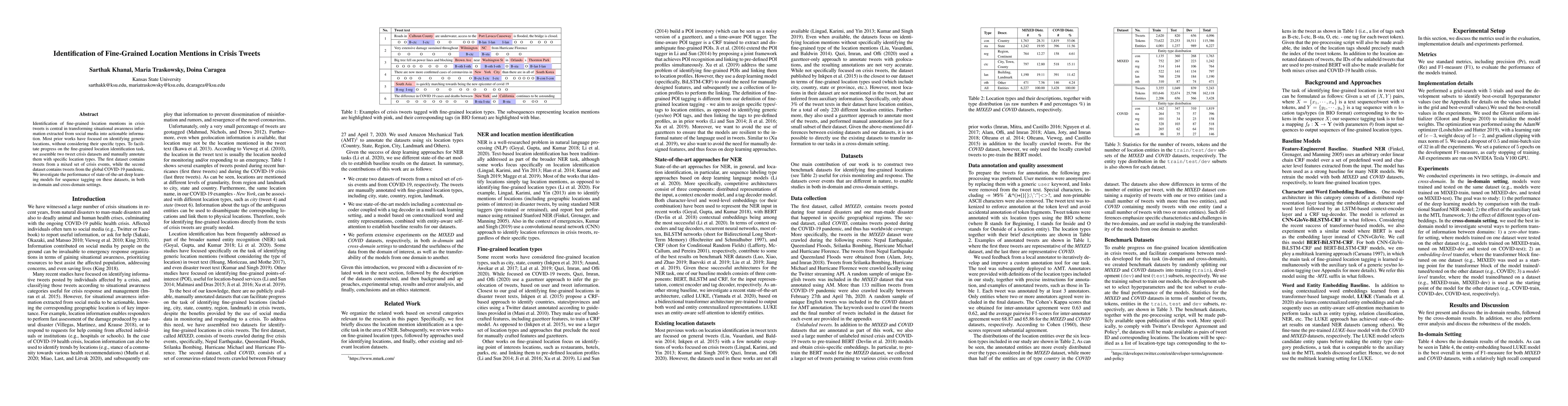 This paper identifies fine-grained location mentions in crisis tweets using annotated datasets from various crisis events and the COVID-19 pandemic. It evaluates the performance of deep learning models for sequence tagging to extract specific location types, comparing in-domain and cross-domain settings.