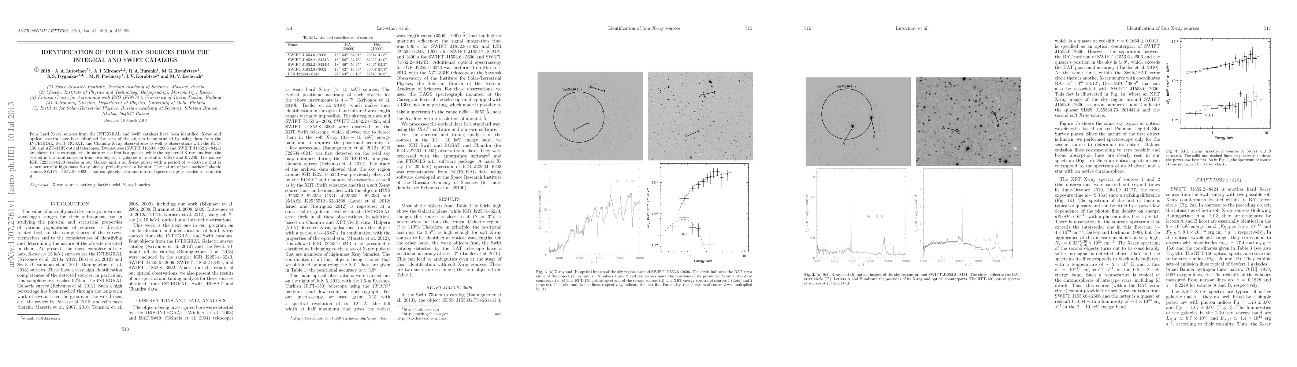 This paper identifies four hard X-ray sources from the INTEGRAL and Swift catalogs, utilizing data from multiple observatories. Two extragalactic sources are identified: one as a quasar and the other as emission from two Seyfert 1 galaxies. An X-ray pulsar in a high-mass X-ray binary is found in the Galactic source, while the nature of another Galactic source remains unclear, requiring further infrared spectroscopy.