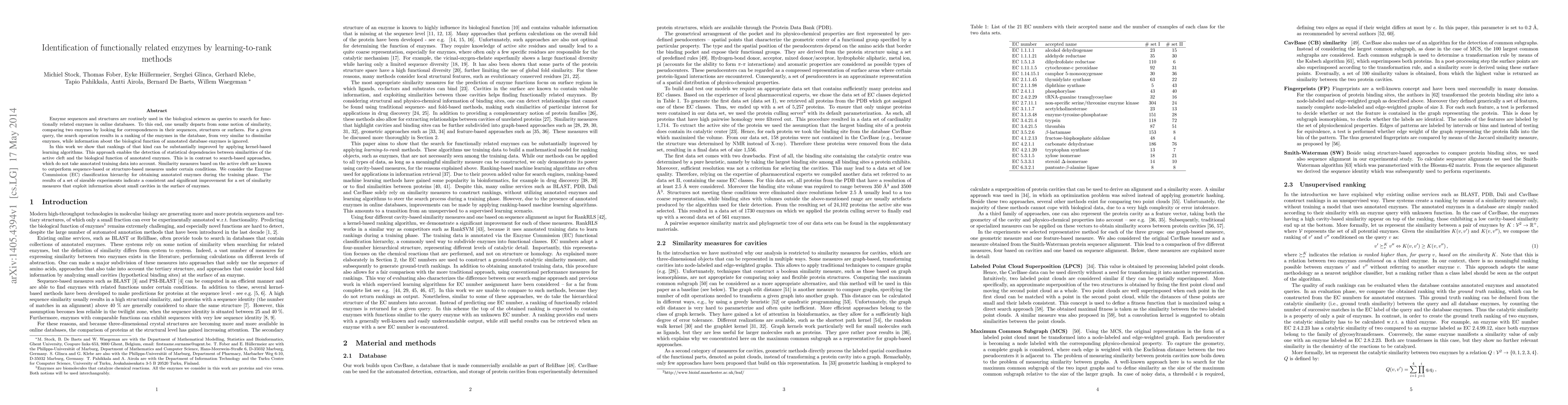 This paper proposes using kernel-based learning algorithms to improve the ranking of functionally related enzymes based on the active cleft similarities, rather than relying solely on sequence or structure comparisons. The approach leverages the Enzyme Commission classification hierarchy for training, demonstrating significant improvements over traditional search-based methods.