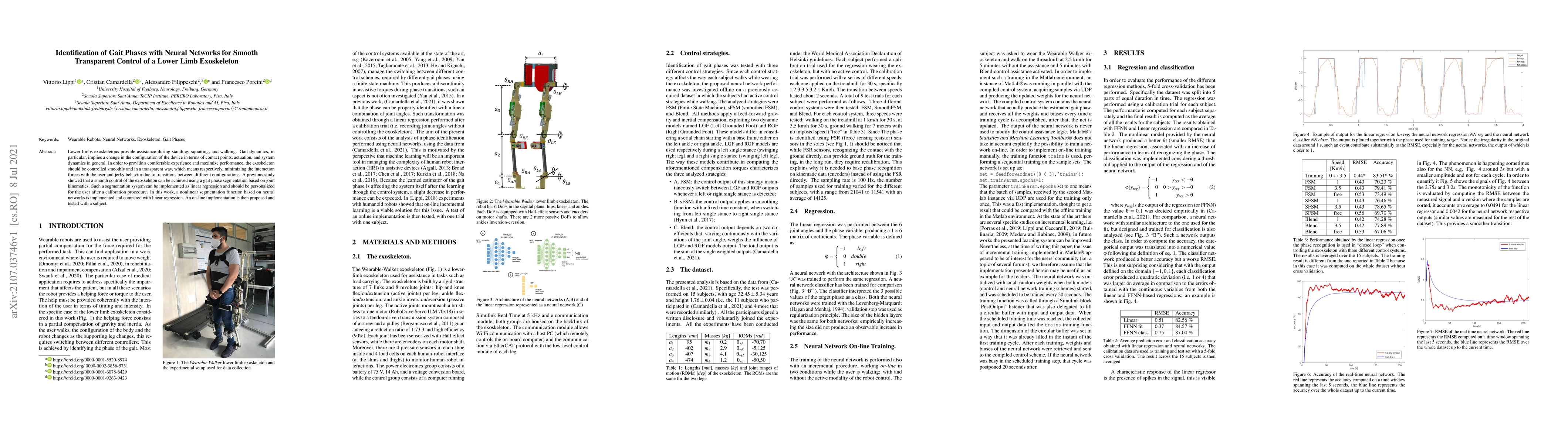 This paper proposes a neural network-based approach to identify gait phases for smooth control of lower limb exoskeletons, aiming to minimize interaction forces and jerky transitions. It compares neural networks with linear regression and tests an online implementation on a subject.