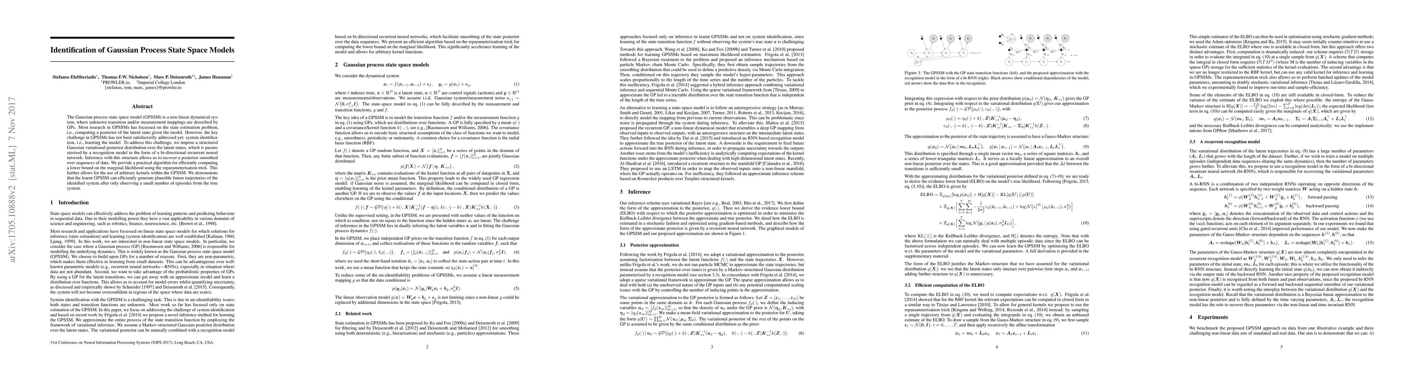 This paper proposes a structured Gaussian variational posterior for identifying Gaussian process state space models (GPSSMs) using a bi-directional RNN. The method efficiently computes a lower bound on the marginal likelihood, enabling the use of various kernels and demonstrating the ability to generate plausible future trajectories from limited data.