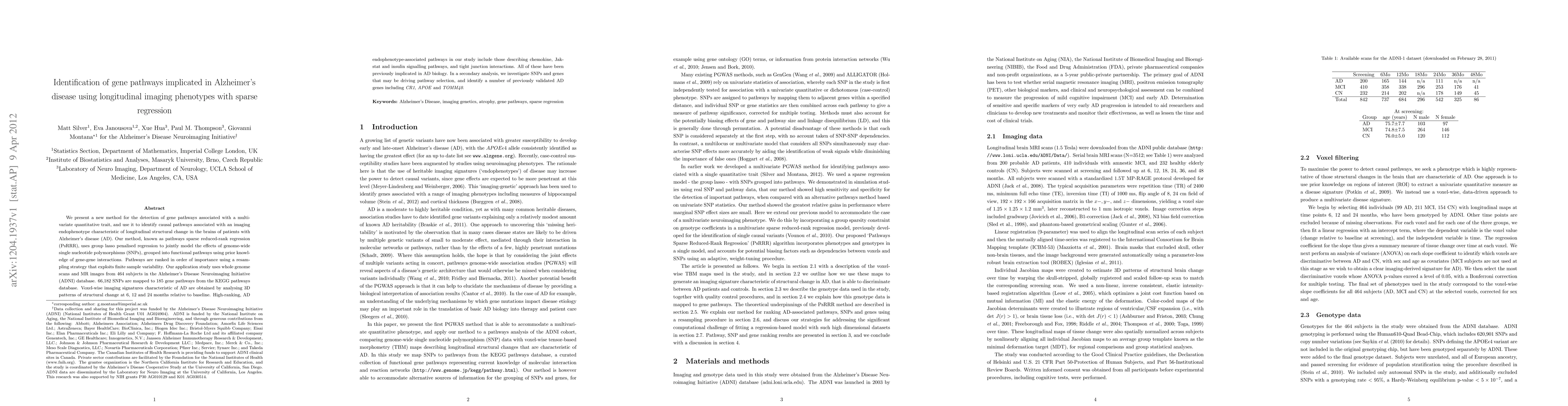 This study introduces pathways sparse reduced-rank regression (PsRRR) to identify gene pathways linked to Alzheimer's disease (AD) using longitudinal imaging data. The method identifies important pathways, including chemokine, Jak-stat, and insulin signalling, and validates known AD-related genes like CR1, APOE, and TOMM40.