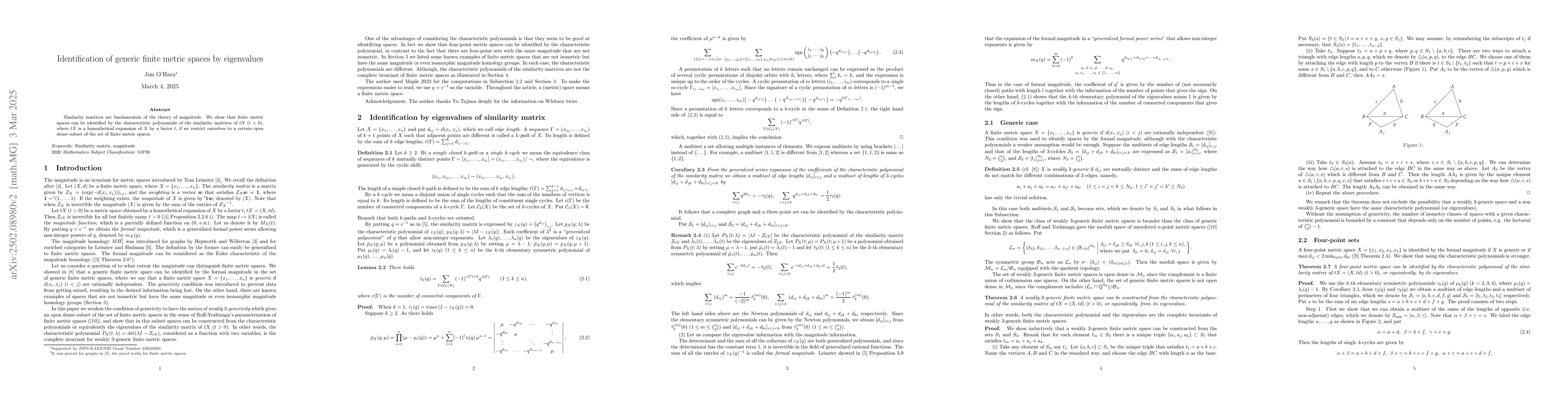 The paper introduces a method for identifying finite metric spaces using eigenvalues of similarity matrices of tX (t > 0), providing a stronger approach than magnitude homology for four-point spaces.