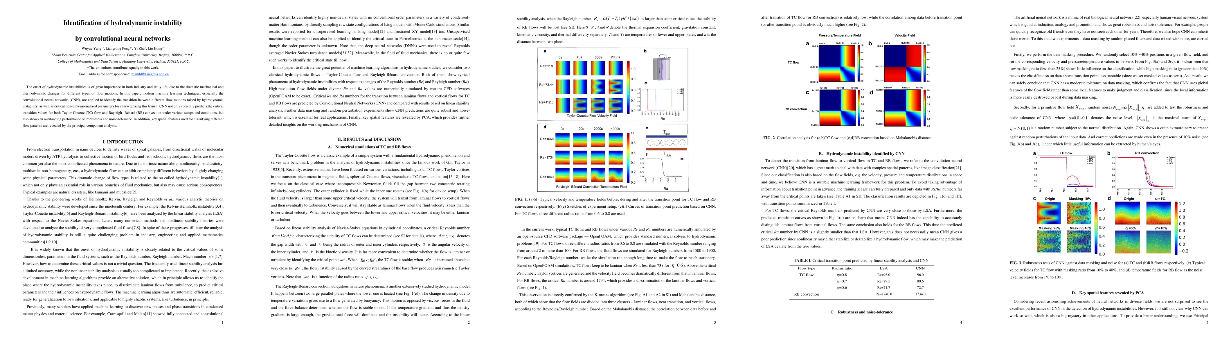 Researchers used convolutional neural networks to identify hydrodynamic instability in two common types of flow motions, achieving high accuracy and robustness. The study reveals key spatial features that distinguish different flow patterns.