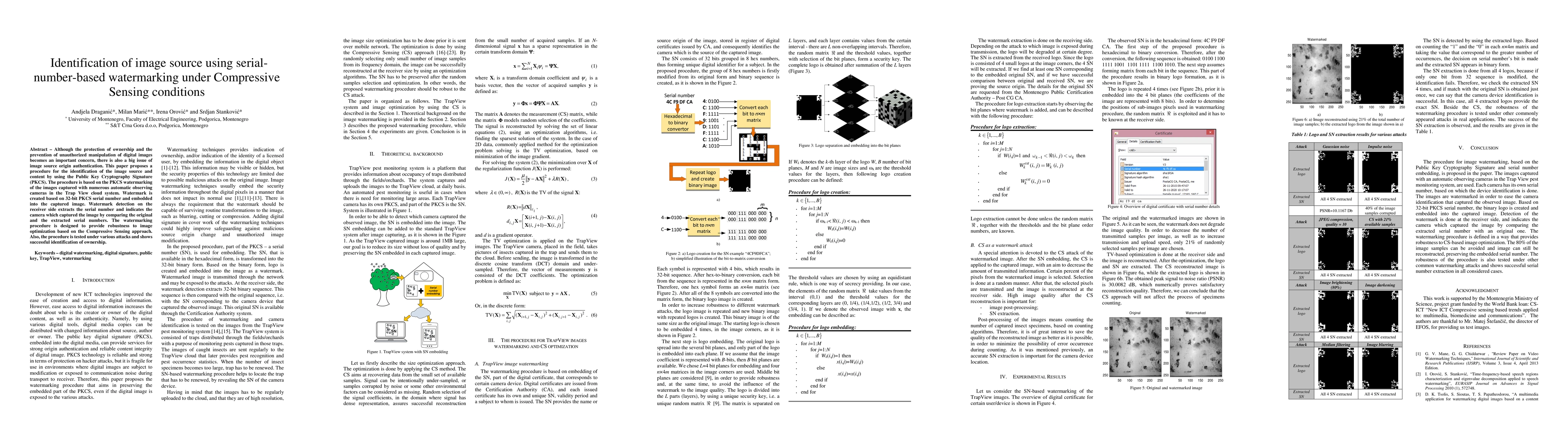 Although the protection of ownership and the prevention of unauthorized manipulation of digital images becomes an important concern, there is also a big issue of image source origin authentication. This paper proposes a procedure for the identification of the image source and content by using the Public Key Cryptography Signature (PKCS). The procedure is based on the PKCS watermarking of the images captured with numerous automatic observing cameras in the Trap View cloud system. Watermark is created based on 32-bit PKCS serial number and embedded into the captured image. Watermark detection on the receiver side extracts the serial number and indicates the camera which captured the image by comparing the original and the extracted serial numbers. The watermarking procedure is designed to provide robustness to image optimization based on the Compressive Sensing approach. Also, the procedure is tested under various attacks and shows successful identification of ownership.