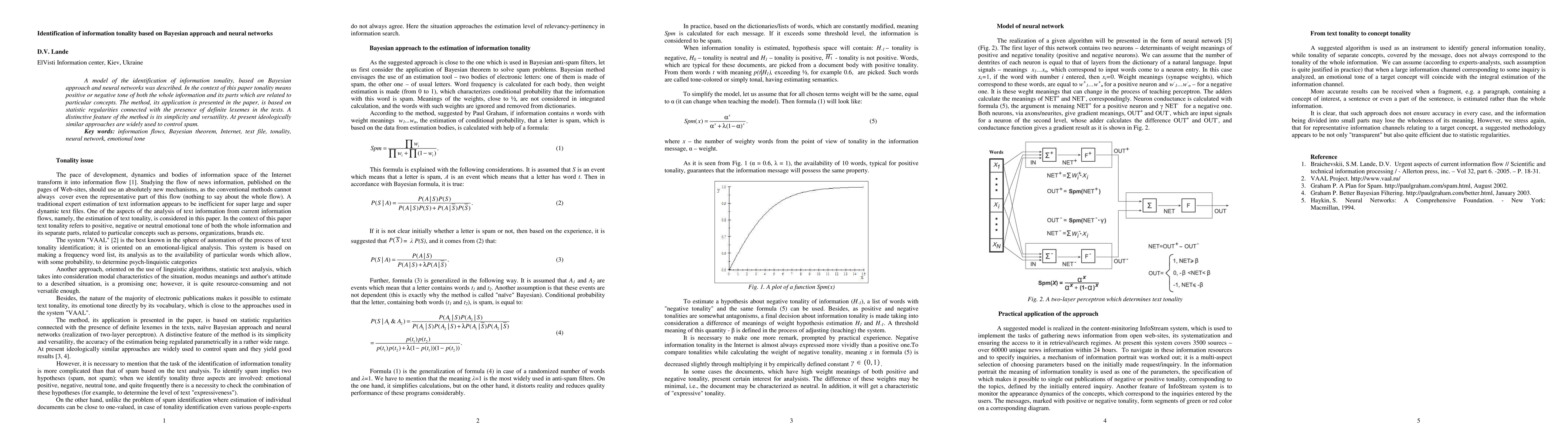 This paper proposes a model for identifying information tonality using a combination of Bayesian approach and neural networks, focusing on detecting positive or negative tones in texts related to specific concepts. The method leverages statistical regularities of specific lexemes and is noted for its simplicity and versatility, with applications similar to current spam control techniques.