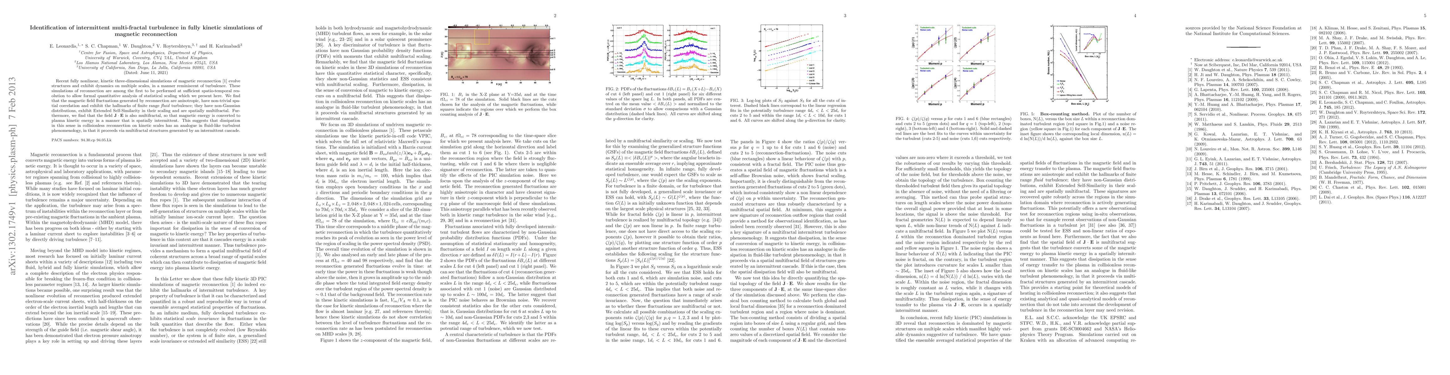 Recent fully nonlinear, kinetic three-dimensional simulations of magnetic reconnection [Daughton et al. 2011] evolve structures and exhibit dynamics on multiple scales, in a manner reminiscent of turbulence. These simulations of reconnection are among the first to be performed at sufficient spatio-temporal resolution to allow formal quantitative analysis of statistical scaling which we present here. We find that the magnetic field fluctuations generated by reconnection are anisotropic, have non-trivial spatial correlation and exhibit the hallmarks of finite range fluid turbulence; they have non-Gaussian distributions, exhibit Extended Self-Similarity in their scaling and are spatially multifractal. Furthermore, we find that the field J.E is also multifractal, so that magnetic energy is converted to plasma kinetic energy in a manner that is spatially intermittent. This suggests that dissipation in this sense in collisionless reconnection on kinetic scales has an analogue in fluid-like turbulent phenomenology, in that it proceeds via multifractal structures generated by an intermittent cascade.