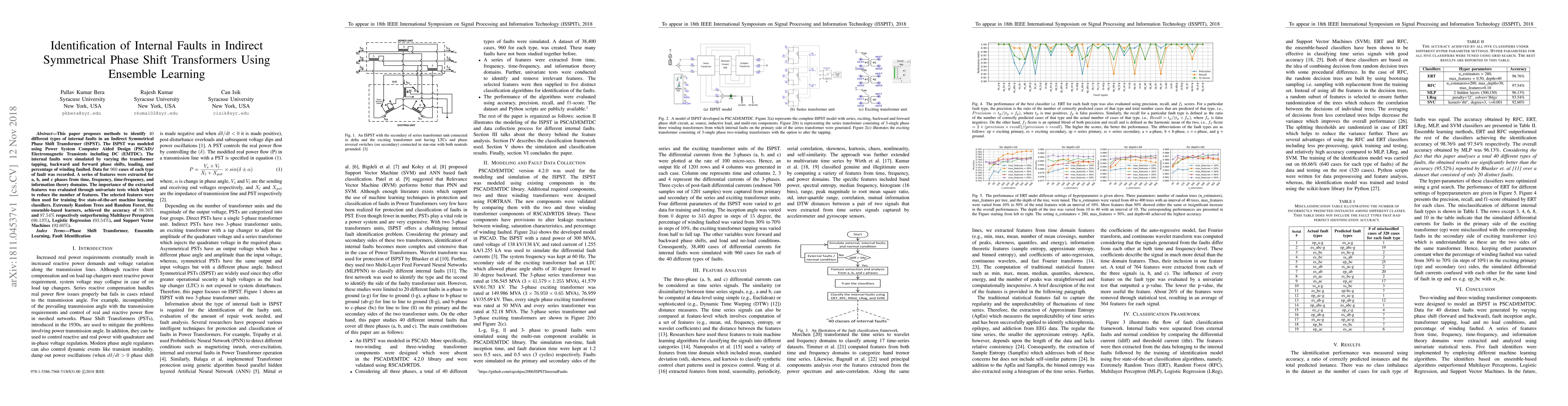 This paper develops ensemble learning methods to identify 40 types of internal faults in Indirect Symmetrical Phase Shift Transformers, achieving 98.76% accuracy with Extremely Random Trees. Various features were extracted and evaluated, leading to effective fault detection using ensemble classifiers.