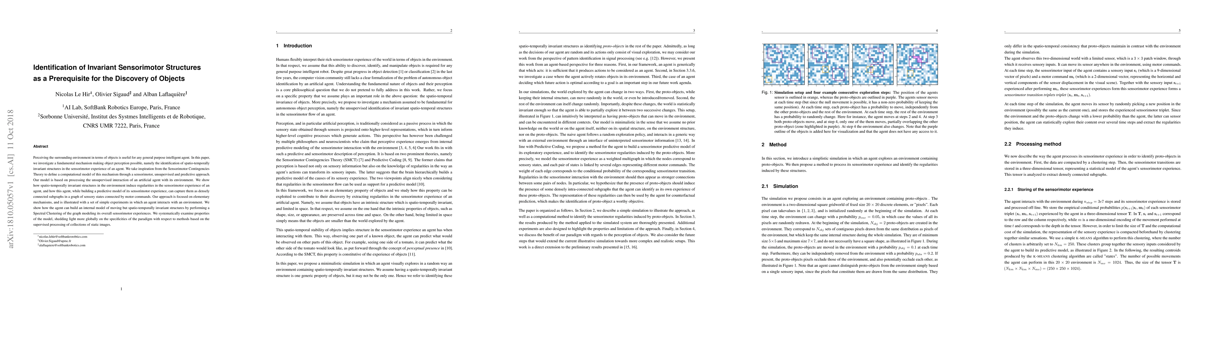 Perceiving the surrounding environment in terms of objects is useful for any general purpose intelligent agent. In this paper, we investigate a fundamental mechanism making object perception possible, namely the identification of spatio-temporally invariant structures in the sensorimotor experience of an agent. We take inspiration from the Sensorimotor Contingencies Theory to define a computational model of this mechanism through a sensorimotor, unsupervised and predictive approach. Our model is based on processing the unsupervised interaction of an artificial agent with its environment. We show how spatio-temporally invariant structures in the environment induce regularities in the sensorimotor experience of an agent, and how this agent, while building a predictive model of its sensorimotor experience, can capture them as densely connected subgraphs in a graph of sensory states connected by motor commands. Our approach is focused on elementary mechanisms, and is illustrated with a set of simple experiments in which an agent interacts with an environment. We show how the agent can build an internal model of moving but spatio-temporally invariant structures by performing a Spectral Clustering of the graph modeling its overall sensorimotor experiences. We systematically examine properties of the model, shedding light more globally on the specificities of the paradigm with respect to methods based on the supervised processing of collections of static images.