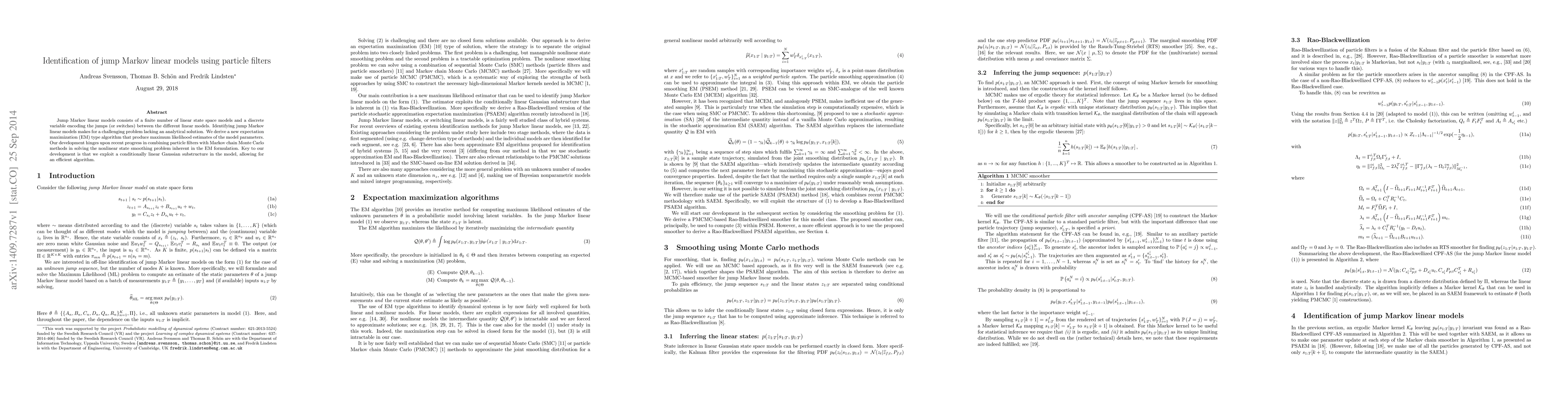 This paper proposes a new expectation maximization algorithm for identifying jump Markov linear models, leveraging particle filters and Markov chain Monte Carlo methods to solve the nonlinear state smoothing problem. The approach exploits a conditionally linear Gaussian substructure for efficient computation.
