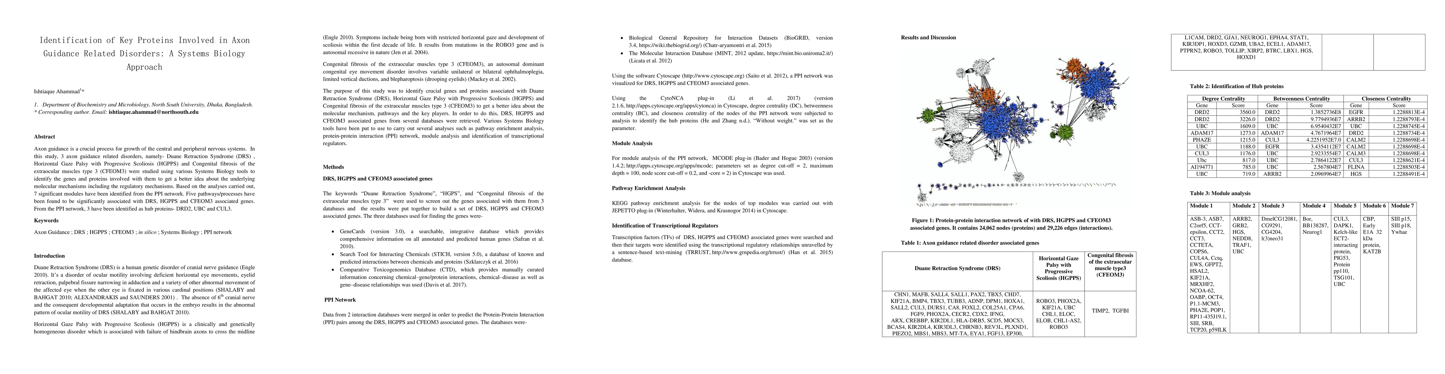 This study uses systems biology tools to identify genes and proteins involved in three axon guidance disorders, revealing seven significant modules and five associated pathways. Three hub proteins—DRD2, UBC, and CUL3—were identified as key players in these disorders.