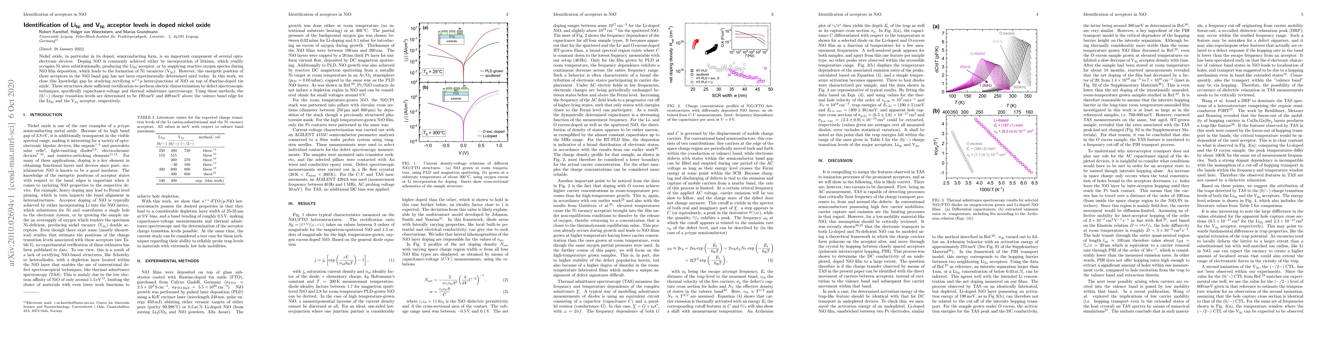 This paper identifies the acceptor levels of Li$_{\text{Ni}}$ and V$_{\text{Ni}}$ in doped nickel oxide using capacitance-voltage and thermal admittance spectroscopy. The Li$_{\text{Ni}}$ acceptor level is found to be 190 meV, while the V$_{\text{Ni}}$ acceptor level is 409 meV above the valence band edge.