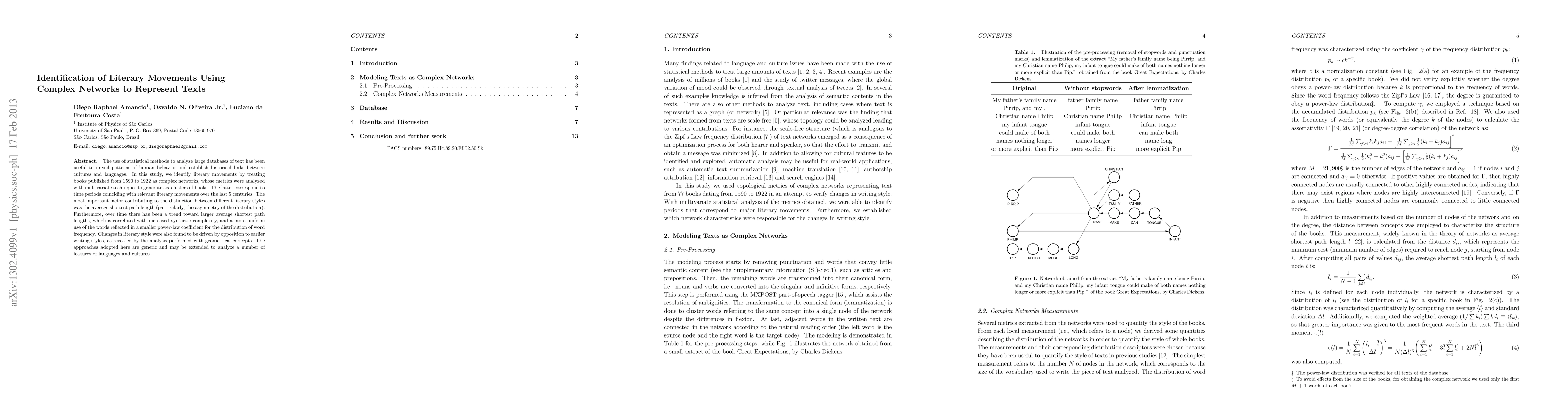 Researchers analyzed literary texts from 1590 to 1922 as complex networks to identify six clusters corresponding to major literary movements. The analysis revealed trends in syntactic complexity and word usage that drove changes in writing styles.