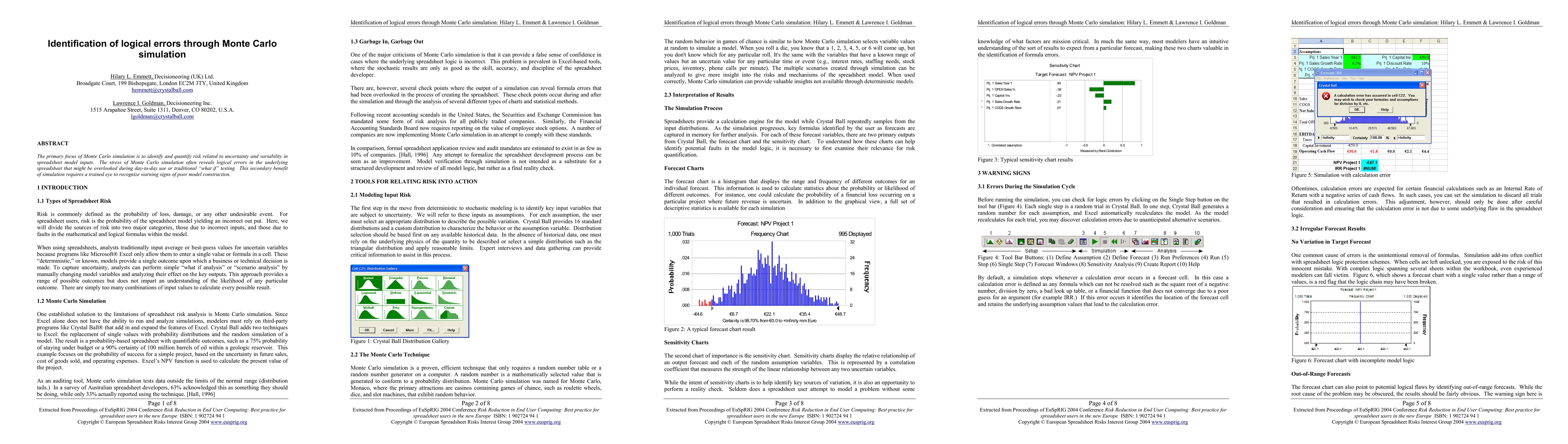 Monte Carlo simulation identifies and quantifies risk from uncertainty in spreadsheet models, often uncovering logical errors that traditional testing might miss. Recognizing these errors requires expertise in interpreting the simulation's warning signs.