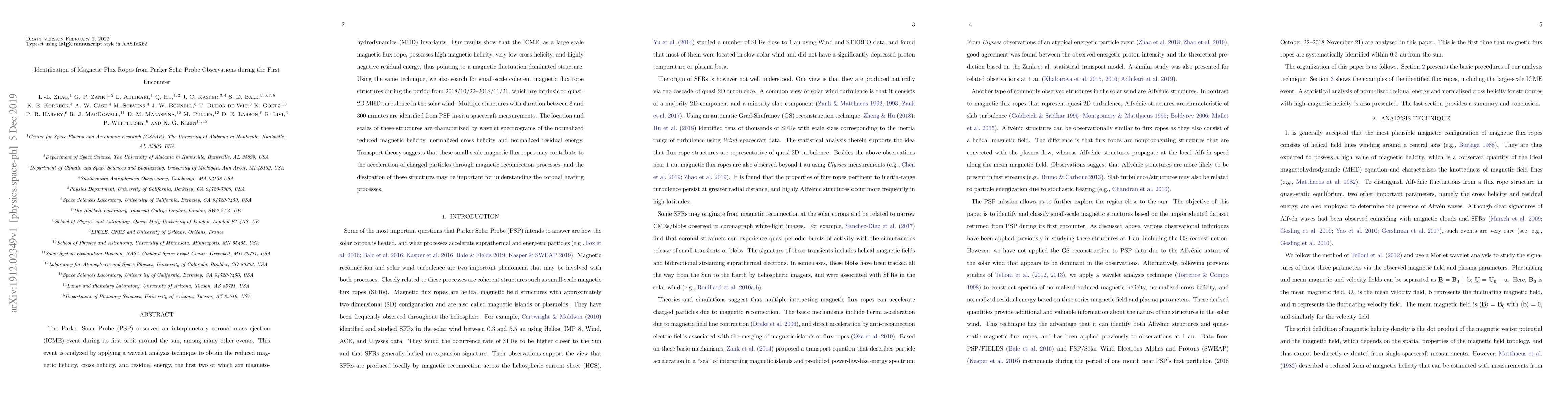 The Parker Solar Probe identified an interplanetary coronal mass ejection as a large-scale magnetic flux rope with high magnetic helicity and low cross helicity during its first orbit around the sun. Additionally, small-scale magnetic flux ropes were found in the solar wind, potentially contributing to particle acceleration and coronal heating.
