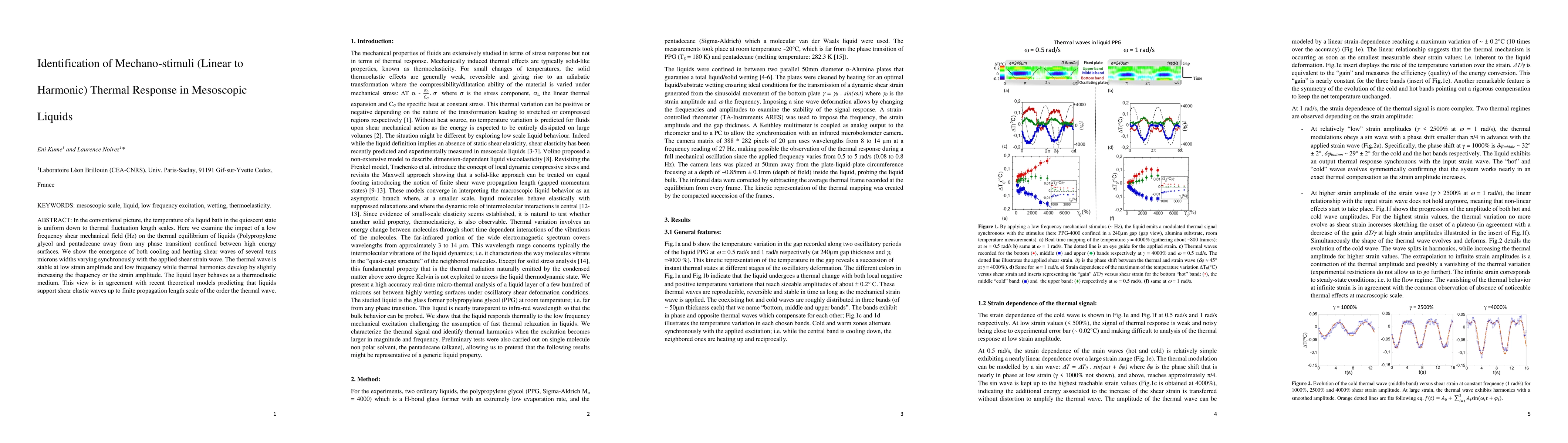 In the conventional picture, the temperature of a liquid bath in the quiescent state is uniform down to thermal fluctuation length scales. Here we examine the impact of a low frequency shear mechanical field (Hz) on the thermal equilibrium of liquids (Polypropylene glycol and pentadecane away from any phase transition) confined between high energy surfaces. We show the emergence of both cooling and heating shear waves of several tens microns widths varying synchronously with the applied shear strain wave. The thermal wave is stable at low strain amplitude and low frequency while thermal harmonics develop by slightly increasing the frequency or the strain amplitude. The liquid layer behaves as a thermoelastic medium. This view is in agreement with recent theoretical models predicting that liquids support shear elastic waves up to finite propagation length scale of the order the thermal wave.