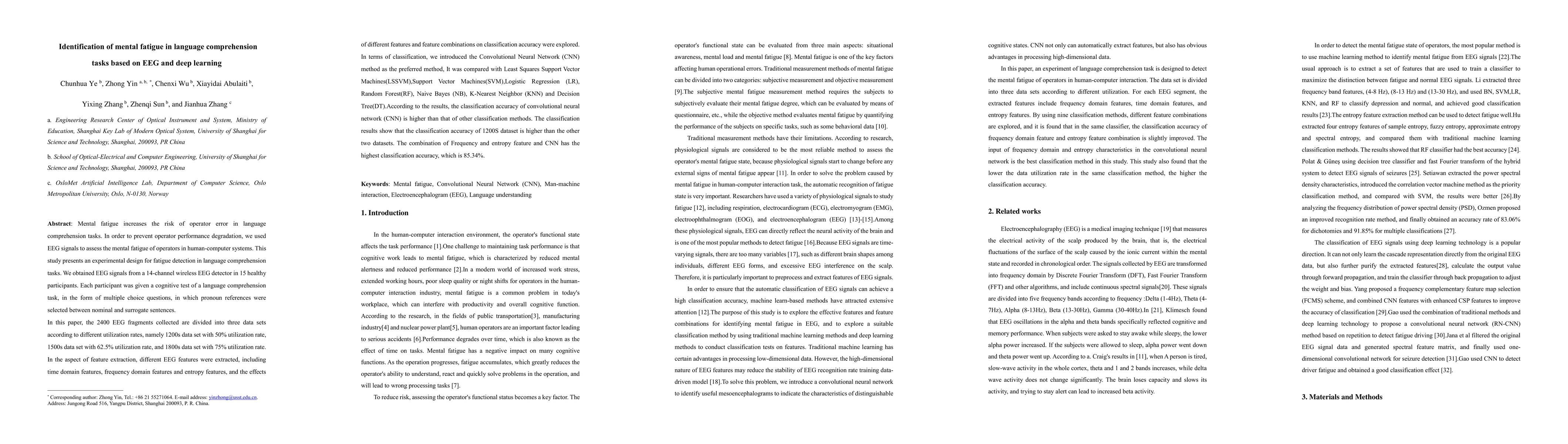 This study uses EEG signals to detect mental fatigue in language comprehension tasks using a Convolutional Neural Network (CNN) with high classification accuracy of 85.34%.