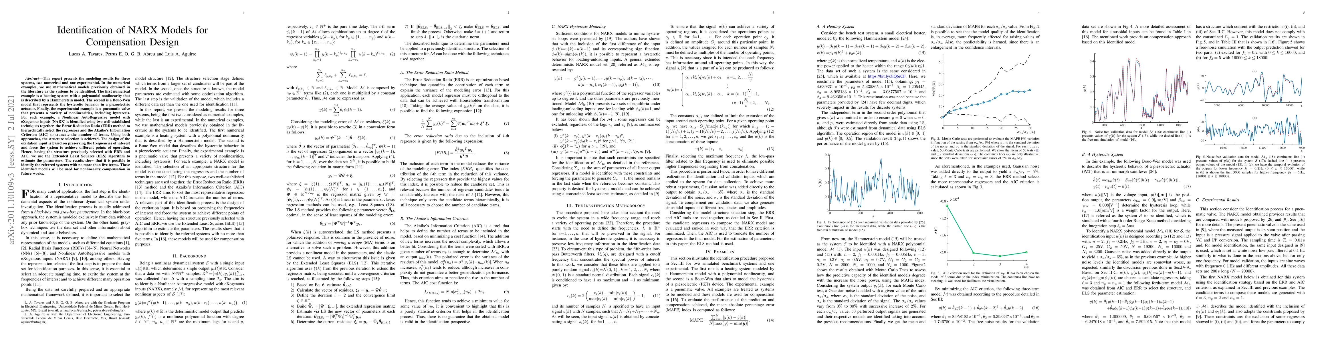 This report presents the modeling results for three systems, two numerical and one experimental. In the numerical examples, we use mathematical models previously obtained in the literature as the systems to be identified. The first numerical example is a heating system with a polynomial nonlinearity that is described by a Hammerstein model. The second is a Bouc-Wen model that represents the hysteretic behavior in a piezoelectric actuator. Finally, the experimental example is a pneumatic valve that presents a variety of nonlinearities, including hysteresis. For each example, a Nonlinear AutoRegressive model with eXogenous inputs (NARX) is identified using two well-established techniques together, the Error Reduction Ratio (ERR) method to hierarchically select the regressors and the Akaike's Information Criterion (AIC) to truncate the number of terms. Using both approaches, the structure selection is achieved. The design of the excitation input is based on preserving the frequencies of interest and force the system to achieve different points of operation. Hence, having the structure previously selected with ERR and AIC, we use the Extended Least Squares (ELS) algorithm to estimate the parameters. The results show that it is possible to identify the referred systems with no more than five terms. These identified models will be used for nonlinearity compensation in future works.