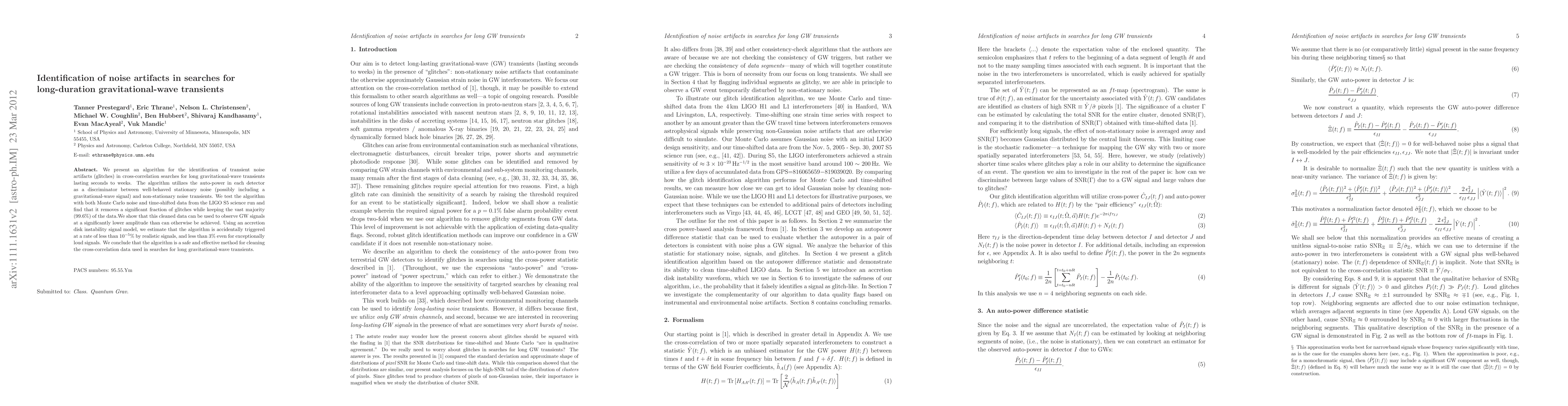 The paper introduces a novel glitch identification algorithm based on auto-power consistency, which significantly improves data quality for long gravitational-wave transient searches.
