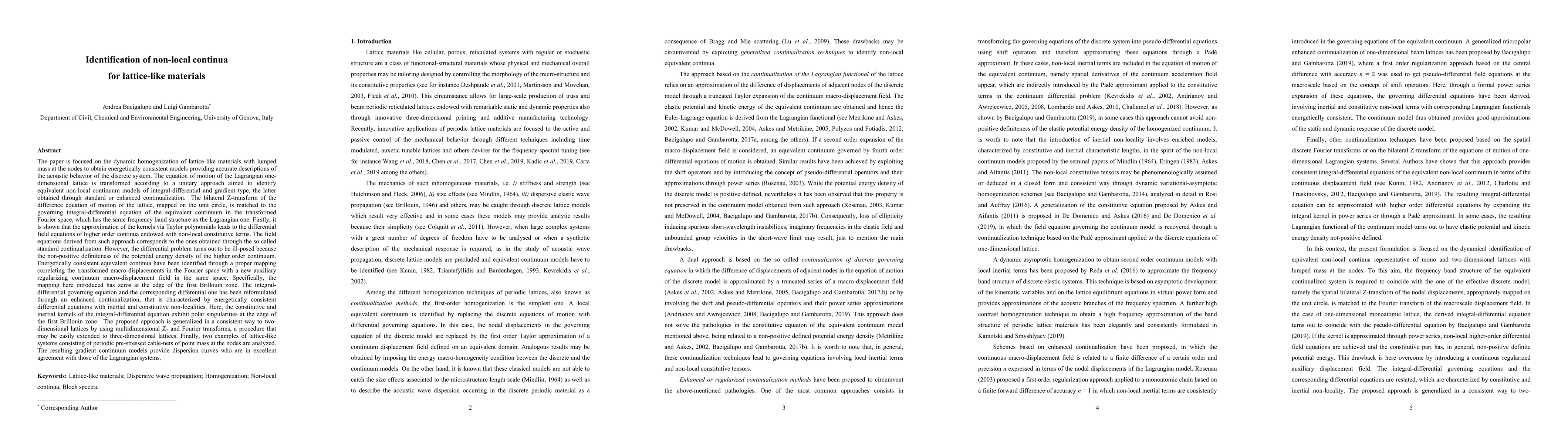 The paper is focused on the dynamic homogenization of lattice-like materials with lumped mass at the nodes to obtain energetically consistent models providing accurate descriptions of the acoustic behavior of the discrete system. The equation of motion of the lattice is transformed according to a unitary approach aimed to identify equivalent non-local continuum models of integral-differential and gradient type, the latter obtained through standard or enhanced continualization. The bilateral Z-transform of the difference equation of motion is matched to the governing integral-differential equation of the equivalent continuum in the transformed Fourier space, which has the same frequency band structure as the Lagrangian one. Firstly, it is shown that the approximation of the kernels via Taylor polynomials leads to the differential field equations of higher order continua endowed with non-local constitutive terms. The field equations derived from such approach corresponds to the ones obtained through the so called standard continualization. However, the differential problem turns out to be ill-posed because the non-positive definiteness of the potential energy density of the higher order continuum. Energetically consistent equivalent continua have been identified through a proper mapping correlating the transformed macro-displacements in the Fourier space with a new auxiliary regularizing continuum macro-displacement field in the same space. Specifically, the mapping here introduced has zeros at the edge of the first Brillouin zone. The integral-differential governing equation and the corresponding differential one has been reformulated through an enhanced continualization that is characterized by energetically consistent differential equations. The constitutive and inertial kernels of the integral-differential equation exhibit polar singularities at the edge of the first Brillouin zone.