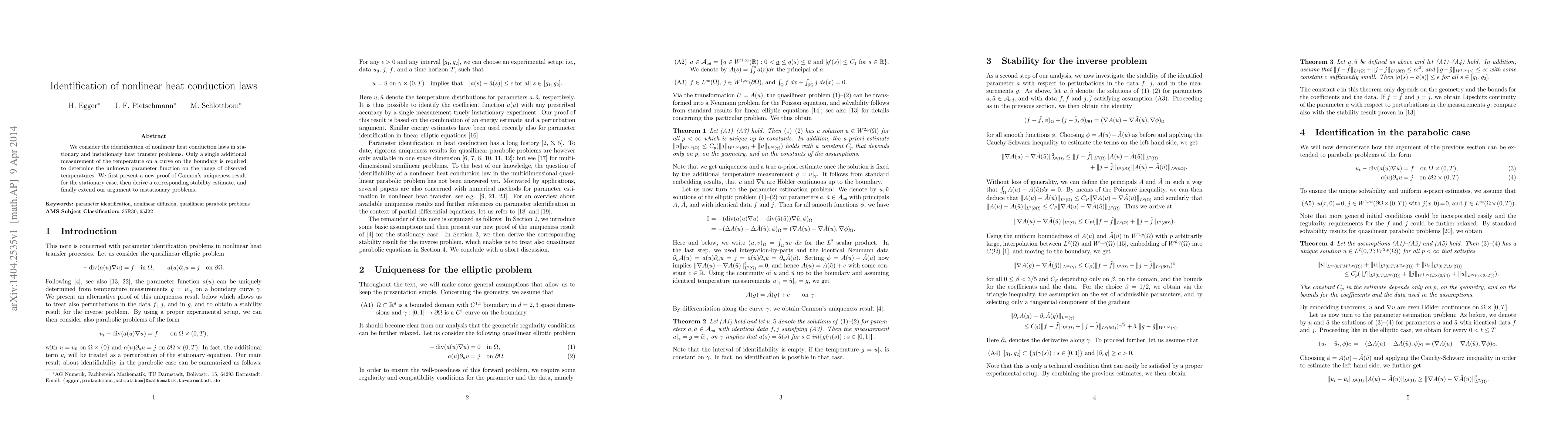 We consider the identification of nonlinear heat conduction laws in stationary and instationary heat transfer problems. Only a single additional measurement of the temperature on a curve on the boundary is required to determine the unknown parameter function on the range of observed temperatures. We first present a new proof of Cannon's uniqueness result for the stationary case, then derive a corresponding stability estimate, and finally extend our argument to instationary problems.