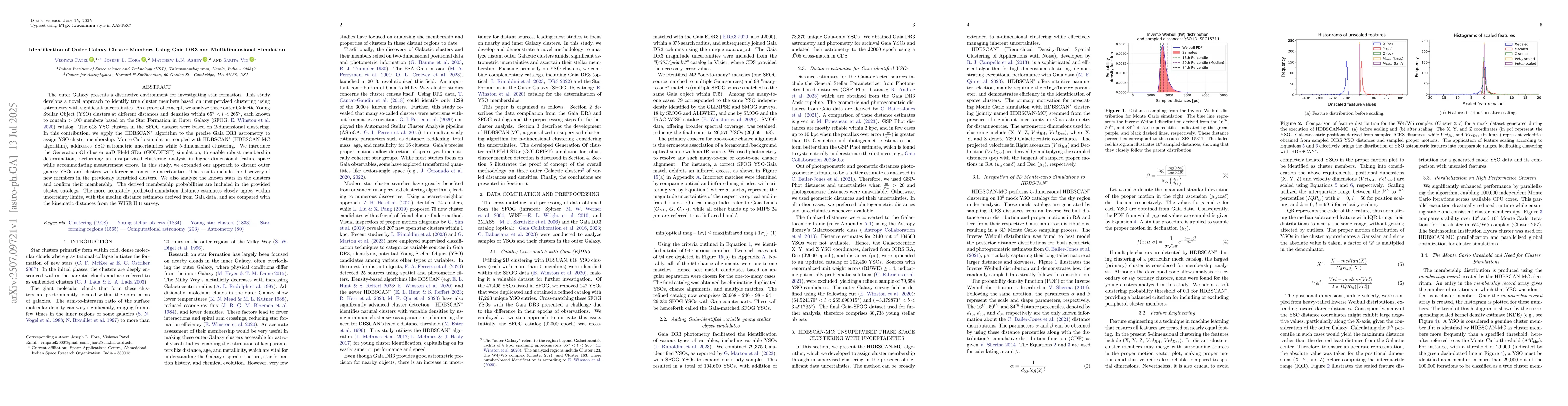 The outer Galaxy presents a distinctive environment for investigating star formation. This study develops a novel approach to identify true cluster members based on unsupervised clustering using astrometry with significant uncertainties. As a proof of concept, we analyze three outer Galactic Young Stellar Object (YSO) clusters at different distances and densities within 65 < l < 265 degrees, each known to contain >100 members based on the Star Formation in Outer Galaxy catalog. The 618 YSO clusters in the SFOG dataset were based on 2-dimensional clustering. In this contribution, we apply the HDBSCAN* algorithm to the precise Gaia DR3 astrometry to assign YSO cluster membership. Monte Carlo simulation, coupled with HDBSCAN* (HDBSCAN-MC algorithm), addresses YSO astrometric uncertainties while 5-dimensional clustering. We introduce the Generation Of cLuster anD FIeld STar (GOLDFIST) simulation, to enable robust membership determination, performing an unsupervised clustering analysis in higher-dimensional feature space while accommodating measurement errors. In this study, we extended our approach to distant outer galaxy YSOs and clusters with larger astrometric uncertainties. The results include the discovery of new members in the previously identified clusters. We also analyze the known stars in the clusters and confirm their membership. The derived membership probabilities are included in the provided cluster catalogs. The more accurately predicted simulation distance estimates closely agree, within uncertainty limits, with the median distance estimates derived from Gaia data, and are compared with the kinematic distances from the WISE HII survey.