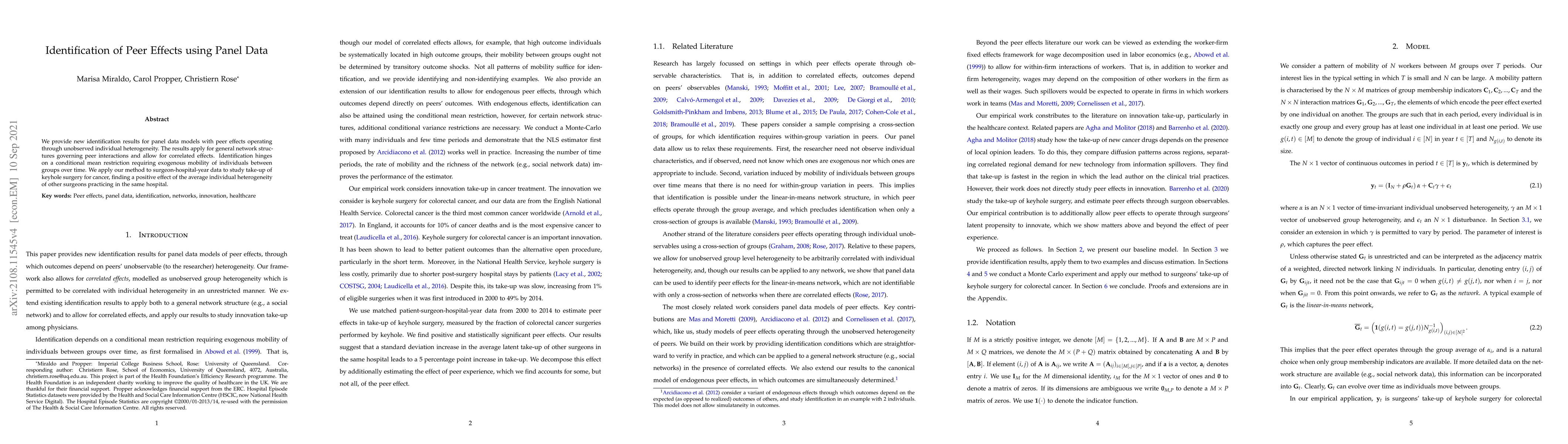 Researchers identified peer effects in panel data models using unobserved individual heterogeneity, finding a positive effect of colleagues' characteristics on take-up of keyhole surgery for cancer patients. The method relies on exogenous mobility between groups to establish correlations.