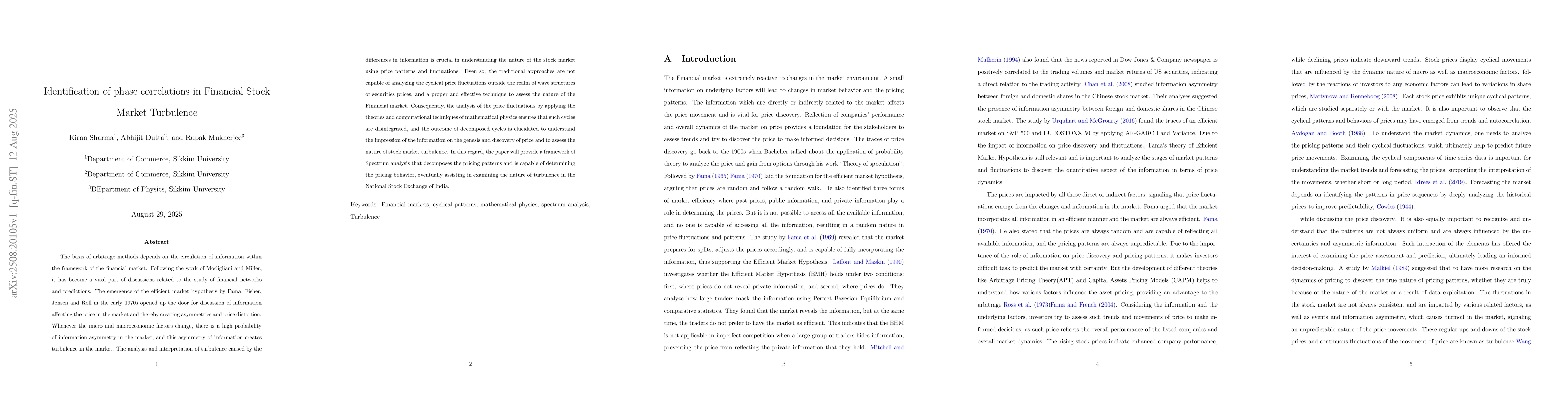 The basis of arbitrage methods depends on the circulation of information within the framework of the financial market. Following the work of Modigliani and Miller, it has become a vital part of discussions related to the study of financial networks and predictions. The emergence of the efficient market hypothesis by Fama, Fisher, Jensen and Roll in the early 1970s opened up the door for discussion of information affecting the price in the market and thereby creating asymmetries and price distortion. Whenever the micro and macroeconomic factors change, there is a high probability of information asymmetry in the market, and this asymmetry of information creates turbulence in the market. The analysis and interpretation of turbulence caused by the differences in information is crucial in understanding the nature of the stock market using price patterns and fluctuations. Even so, the traditional approaches are not capable of analyzing the cyclical price fluctuations outside the realm of wave structures of securities prices, and a proper and effective technique to assess the nature of the Financial market. Consequently, the analysis of the price fluctuations by applying the theories and computational techniques of mathematical physics ensures that such cycles are disintegrated, and the outcome of decomposed cycles is elucidated to understand the impression of the information on the genesis and discovery of price and to assess the nature of stock market turbulence. In this regard, the paper will provide a framework of Spectrum analysis that decomposes the pricing patterns and is capable of determining the pricing behavior, eventually assisting in examining the nature of turbulence in the National Stock Exchange of India.