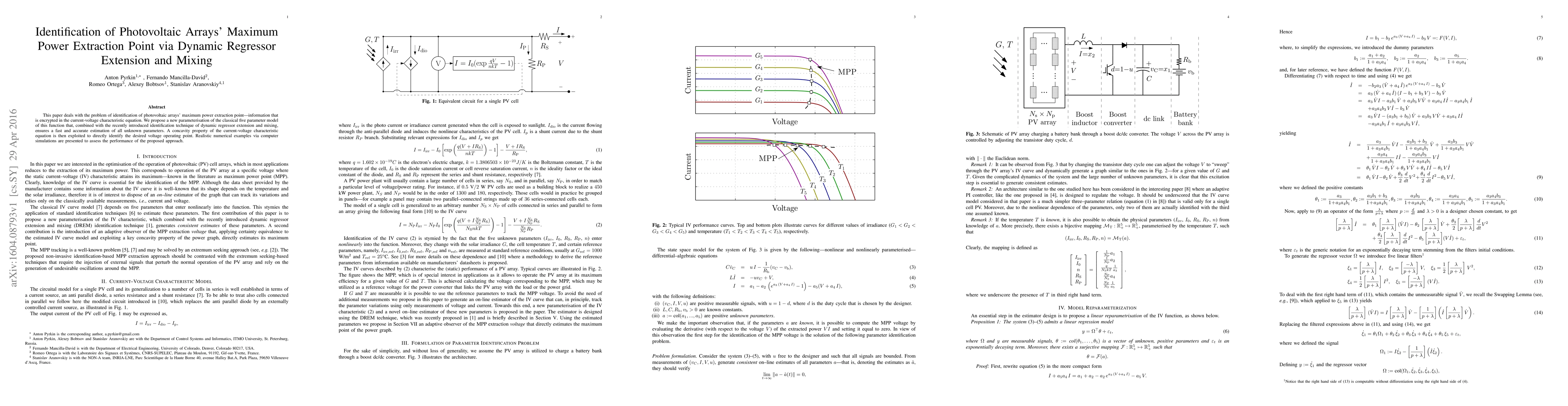 This paper proposes a new parameterization of the five-parameter model for photovoltaic arrays, combined with dynamic regressor extension and mixing, to accurately estimate maximum power extraction points. The method leverages the concavity property of the current-voltage characteristic equation for precise identification, validated through realistic computer simulations.