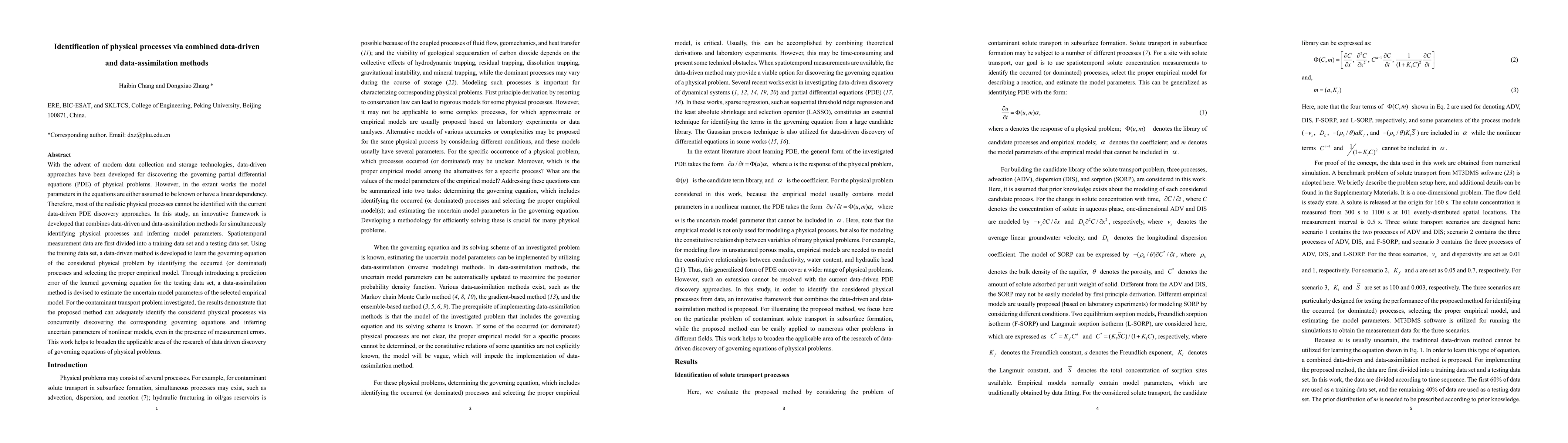 With the advent of modern data collection and storage technologies, data-driven approaches have been developed for discovering the governing partial differential equations (PDE) of physical problems. However, in the extant works the model parameters in the equations are either assumed to be known or have a linear dependency. Therefore, most of the realistic physical processes cannot be identified with the current data-driven PDE discovery approaches. In this study, an innovative framework is developed that combines data-driven and data-assimilation methods for simultaneously identifying physical processes and inferring model parameters. Spatiotemporal measurement data are first divided into a training data set and a testing data set. Using the training data set, a data-driven method is developed to learn the governing equation of the considered physical problem by identifying the occurred (or dominated) processes and selecting the proper empirical model. Through introducing a prediction error of the learned governing equation for the testing data set, a data-assimilation method is devised to estimate the uncertain model parameters of the selected empirical model. For the contaminant transport problem investigated, the results demonstrate that the proposed method can adequately identify the considered physical processes via concurrently discovering the corresponding governing equations and inferring uncertain parameters of nonlinear models, even in the presence of measurement errors. This work helps to broaden the applicable area of the research of data driven discovery of governing equations of physical problems.