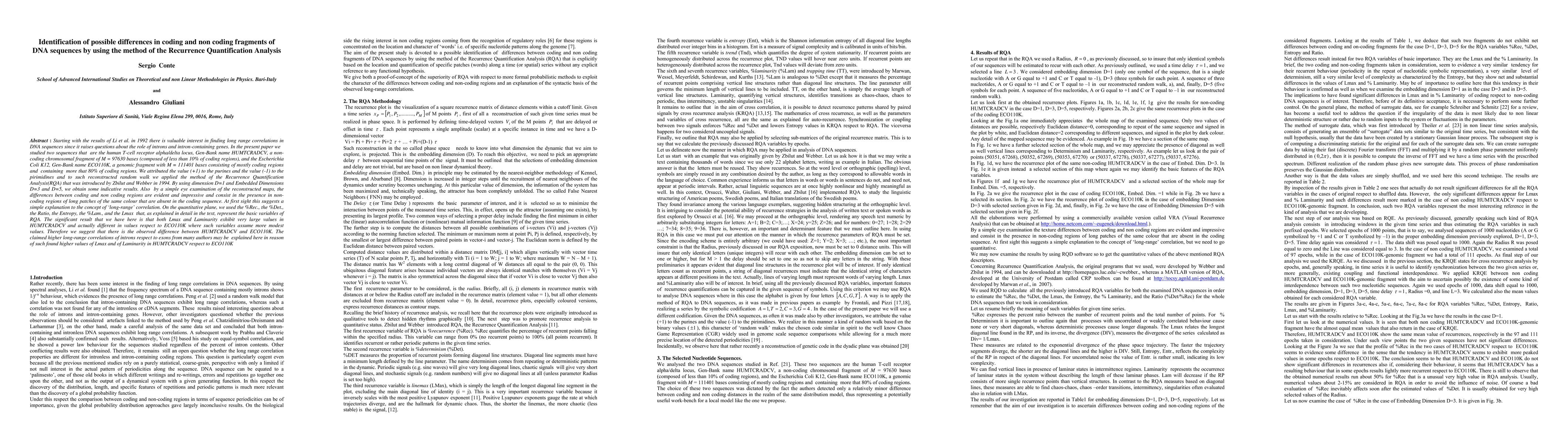 Starting with the results of Li et al. in 1992 there is valuable interest in finding long range correlations in dna sequences since it raises questions about the role of introns and intron-containing genes. In the present paper we studied two sequences. We applied the method of the recurrence quantification analysis (rqa) that was introduced by Zbilut and Webber in 1994. The significant result that we have here is that both Lmax and Laminarity exhibit very large values in non coding respect to coding sequences. Therefore we suggest that there the claimed higher long range correlations of introns respect to exons from many authors may be explained here in reason of such found higher values of Lmax and of Laminarity.