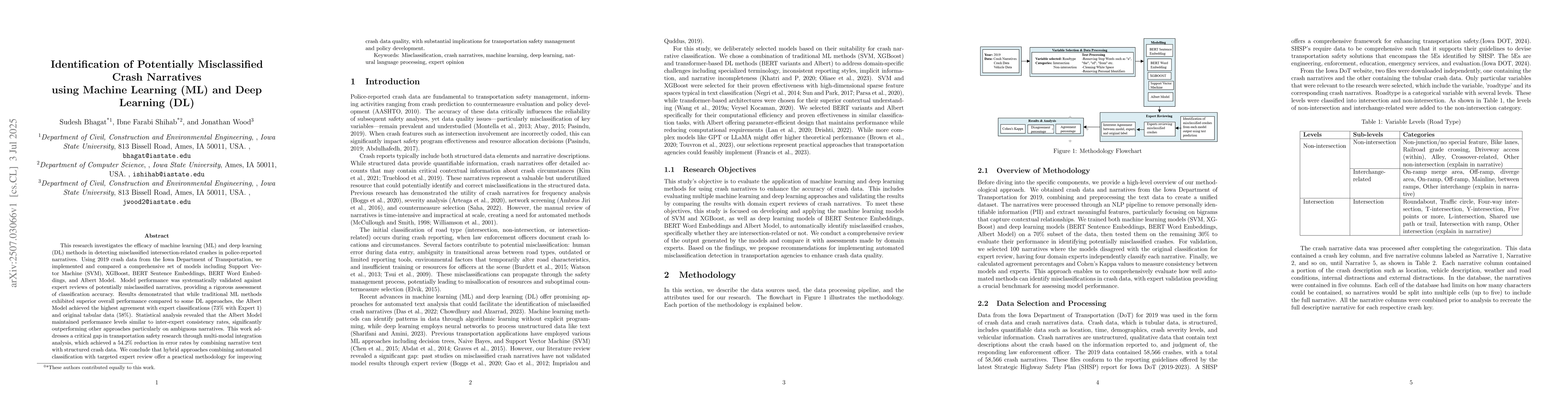 This research investigates the efficacy of machine learning (ML) and deep learning (DL) methods in detecting misclassified intersection-related crashes in police-reported narratives. Using 2019 crash data from the Iowa Department of Transportation, we implemented and compared a comprehensive set of models, including Support Vector Machine (SVM), XGBoost, BERT Sentence Embeddings, BERT Word Embeddings, and Albert Model. Model performance was systematically validated against expert reviews of potentially misclassified narratives, providing a rigorous assessment of classification accuracy. Results demonstrated that while traditional ML methods exhibited superior overall performance compared to some DL approaches, the Albert Model achieved the highest agreement with expert classifications (73% with Expert 1) and original tabular data (58%). Statistical analysis revealed that the Albert Model maintained performance levels similar to inter-expert consistency rates, significantly outperforming other approaches, particularly on ambiguous narratives. This work addresses a critical gap in transportation safety research through multi-modal integration analysis, which achieved a 54.2% reduction in error rates by combining narrative text with structured crash data. We conclude that hybrid approaches combining automated classification with targeted expert review offer a practical methodology for improving crash data quality, with substantial implications for transportation safety management and policy development.