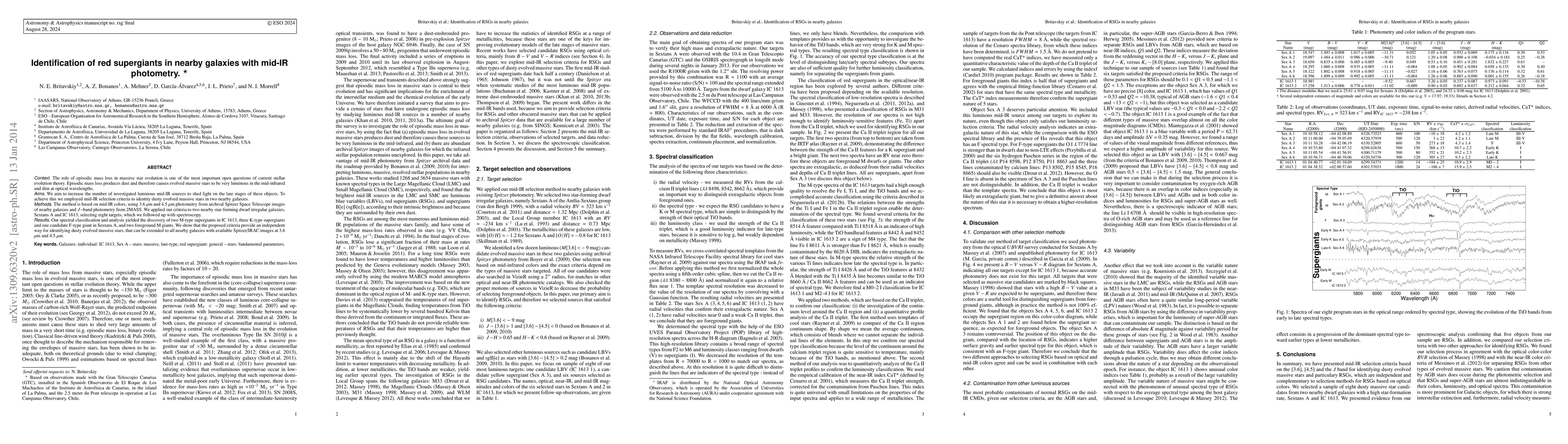 This paper identifies red supergiants in nearby galaxies using mid-IR photometry, focusing on the role of episodic mass loss in massive star evolution. The authors applied mid-IR color criteria to select and classify luminous mid-IR sources in two nearby galaxies, discovering several red supergiants and demonstrating a new method for identifying dusty evolved massive stars.
