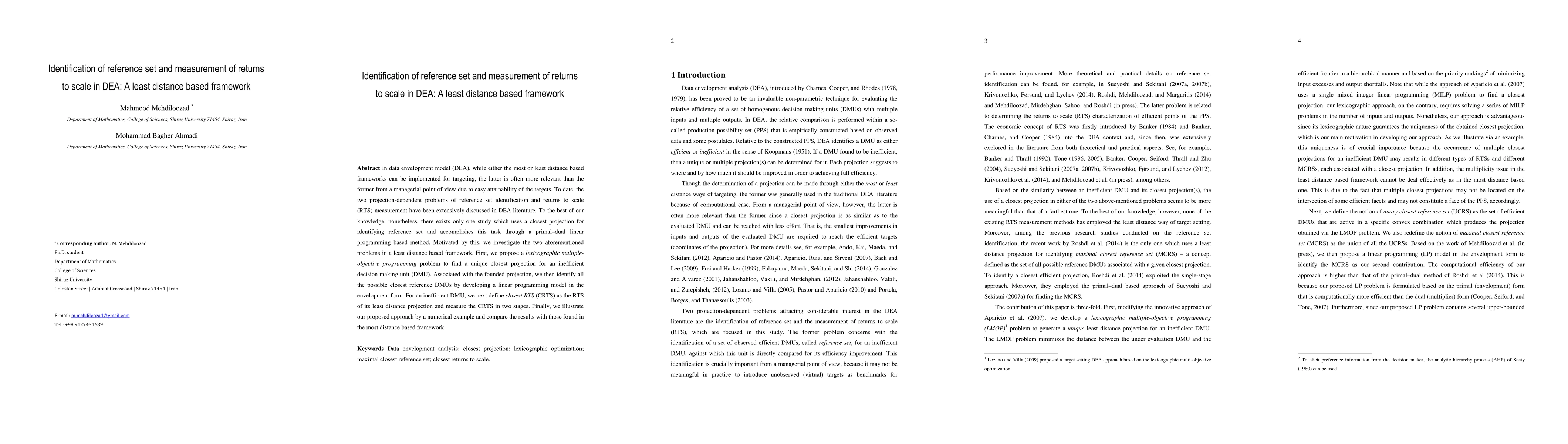 This paper proposes a least distance based framework for identifying the reference set and measuring returns to scale in Data Envelopment Analysis (DEA). It introduces a lexicographic multiple-objective programming problem to find the closest projection for inefficient decision making units (DMUs) and uses linear programming to identify the closest reference DMUs. The study defines closest returns to scale and measures them in two stages, demonstrating the approach with a numerical example and comparing results with the most distance based framework.