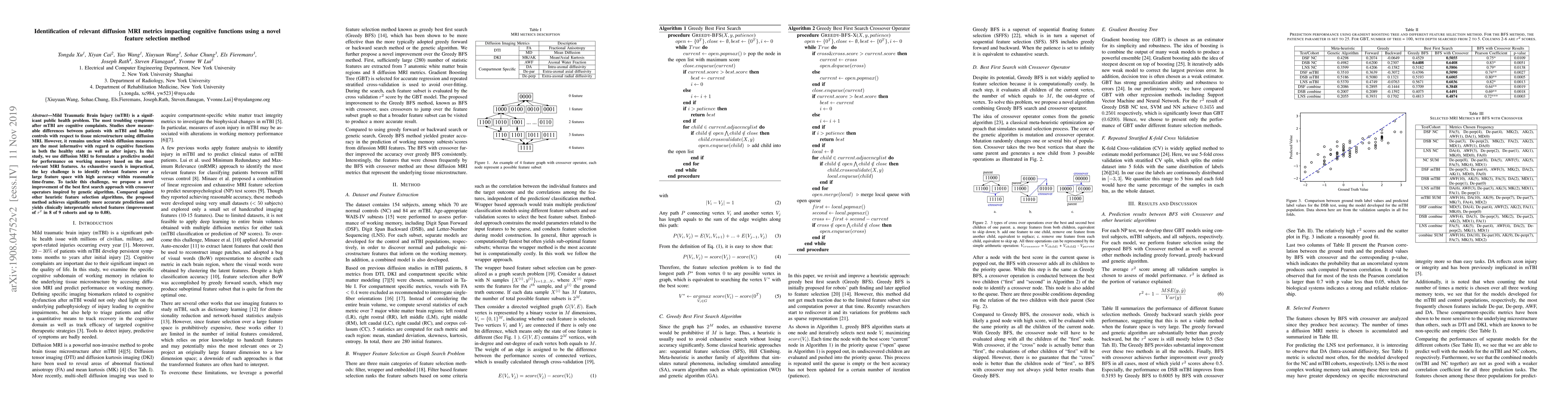 This paper proposes a novel feature selection method to identify diffusion MRI metrics that best predict working memory performance in individuals with mild traumatic brain injury (mTBI). The method, an improved best first search with crossover operators, outperforms other algorithms in accuracy and provides clinically interpretable features.