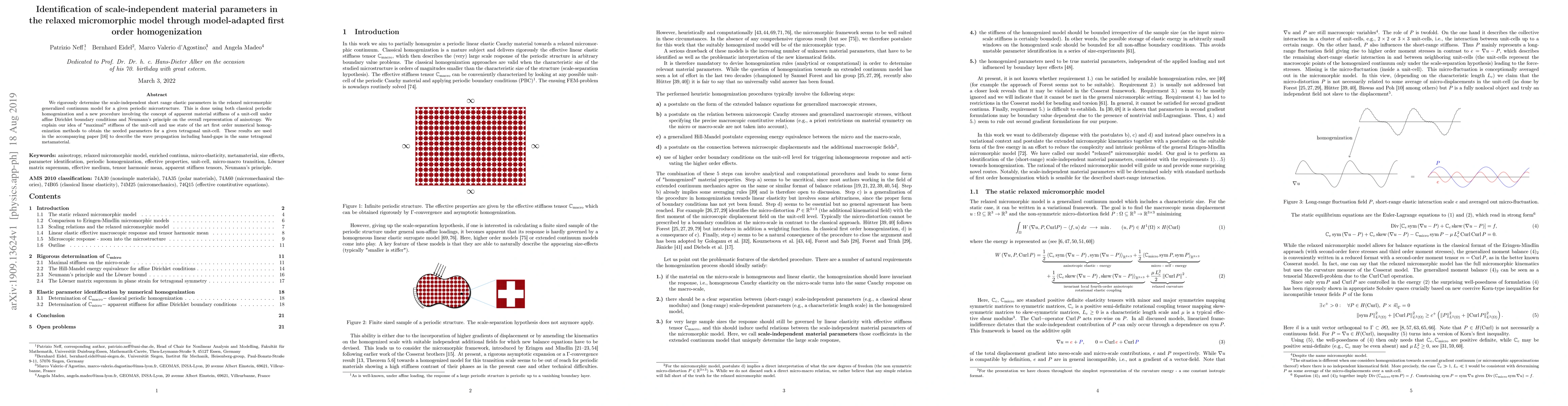 We rigorously determine the scale-independent short range elastic parameters in the relaxed micromorphic generalized continuum model for a given periodic microstructure. This is done using both classical periodic homogenization and a new procedure involving the concept of apparent material stiffness of a unit-cell under affine Dirichlet boundary conditions and Neumann's principle on the overall representation of anisotropy. We explain our idea of "maximal" stiffness of the unit-cell and use state of the art first order numerical homogenization methods to obtain the needed parameters for a given tetragonal unit-cell. These results are used in the accompanying paper [16] to describe the wave propagation including band-gaps in the same tetragonal metamaterial.