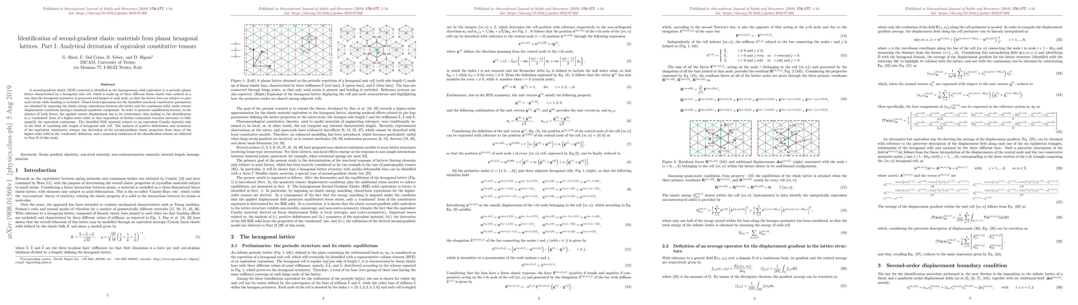 A second-gradient elastic (SGE) material is identified as the homogeneous solid equivalent to a periodic planar lattice characterized by a hexagonal unit cell, which is made up of three different linear elastic bars ordered in a way that the hexagonal symmetry is preserved and hinged at each node, so that the lattice bars are subject to pure axial strain while bending is excluded. Closed form-expressions for the identified non-local constitutive parameters are obtained by imposing the elastic energy equivalence between the lattice and the continuum solid, under remote displacement conditions having a dominant quadratic component. In order to generate equilibrated stresses, in the absence of body forces, the applied remote displacement has to be constrained, thus leading to the identification in a \lq condensed' form of a higher-order solid, so that imposition of further constraints becomes necessary to fully quantify the equivalent continuum. The identified SGE material reduces to an equivalent Cauchy material only in the limit of vanishing side length of hexagonal unit cell. The analysis of positive definiteness and symmetry of the equivalent constitutive tensors, the derivation of the second-gradient elastic properties from those of the higher-order solid in the \lq condensed' definition, and a numerical validation of the identification scheme are deferred to Part II of this study.