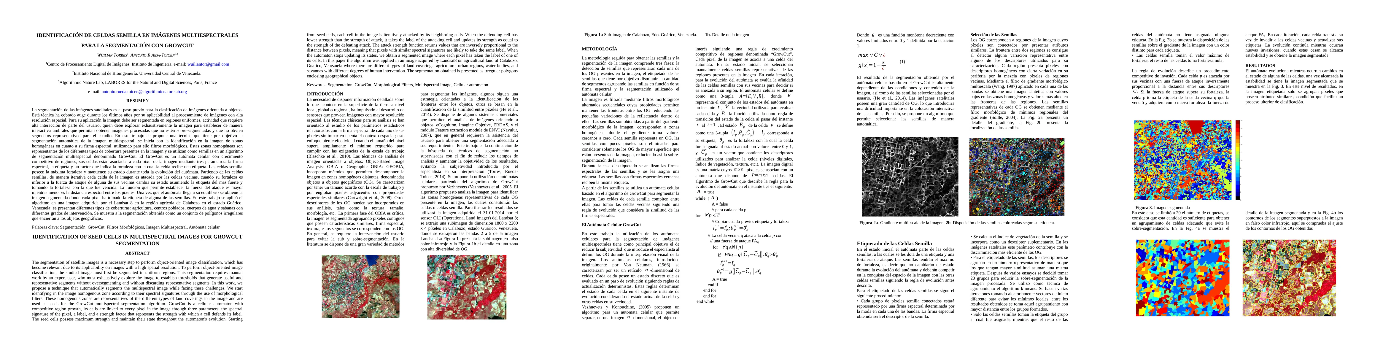 This paper proposes an automated technique for segmenting multispectral satellite images using morphological filters to identify seed cells based on spectral signatures, which are then used to drive the GrowCut segmentation algorithm. The method is tested on Landsat8 imagery in agricultural areas of Venezuela, yielding segmented regions representing different land coverings.
