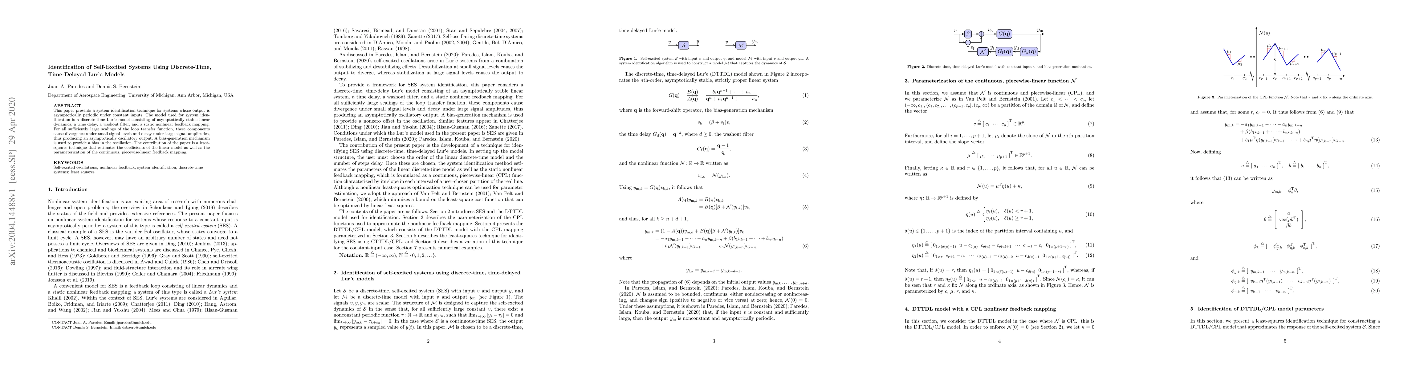 This paper introduces a least-squares technique for identifying self-excited systems using discrete-time Lur'e models, which incorporate stable linear dynamics, time delay, washout filter, and static nonlinear feedback. The method estimates both linear model coefficients and the continuous, piecewise-linear feedback mapping parameters.