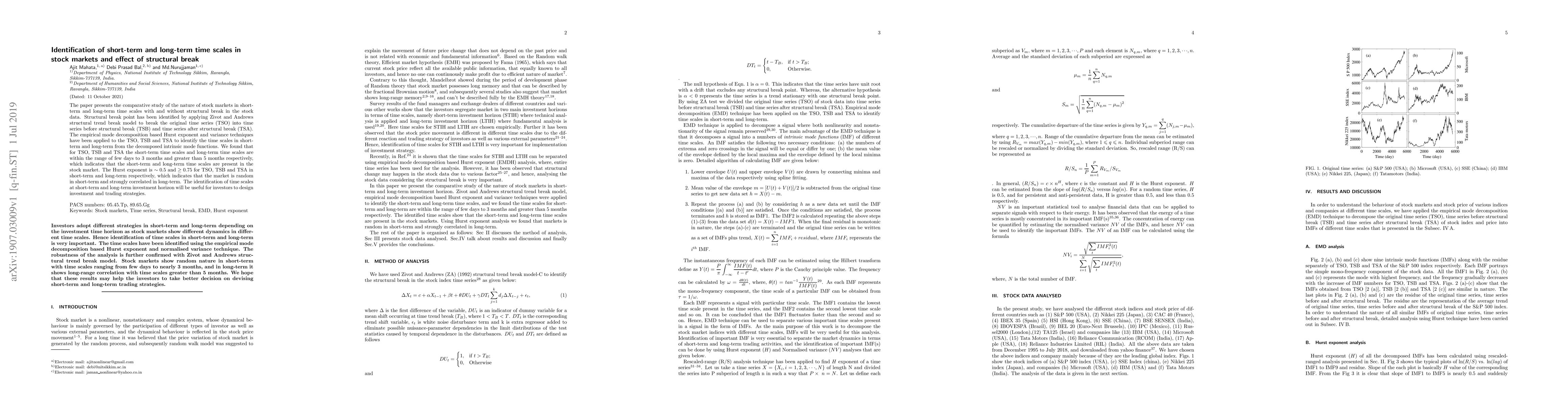 This paper investigates short-term and long-term time scales in stock markets, identifying structural break points using the Zivot and Andrews model, and applying empirical mode decomposition to determine time scales and Hurst exponents. The findings suggest that short-term scales range from a few days to 3 months, while long-term scales exceed 5 months, with the market exhibiting random behavior in the short term and strong correlation in the long term.