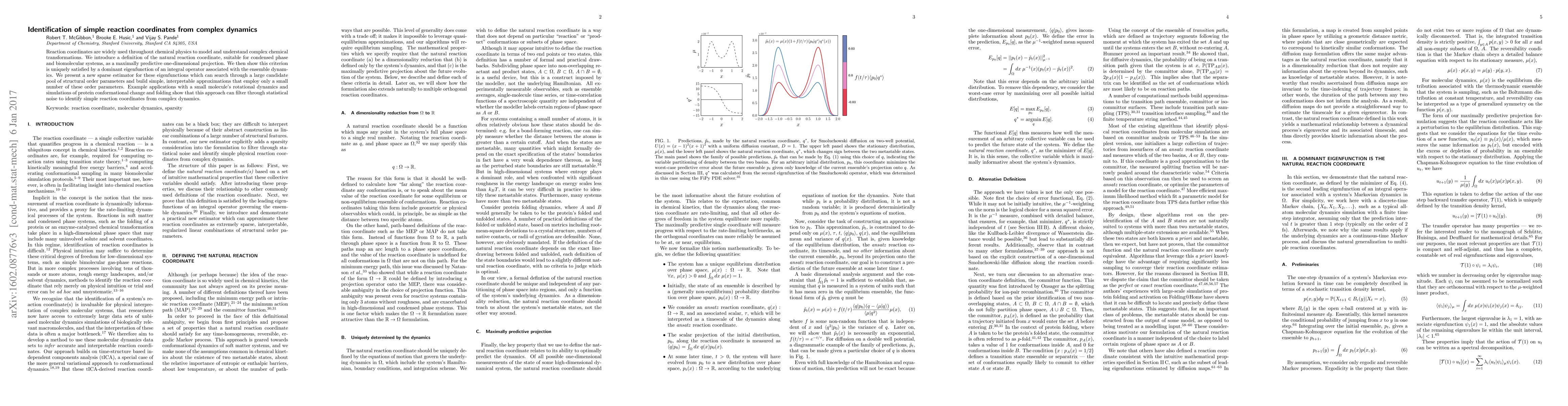 The paper introduces a new definition of the natural reaction coordinate as a maximally predictive one-dimensional projection, suitable for condensed phase and biomolecular systems. It presents a new sparse estimator for these eigenfunctions, capable of searching through a large candidate pool of structural order parameters to build simple, interpretable approximations with a small number of these parameters.