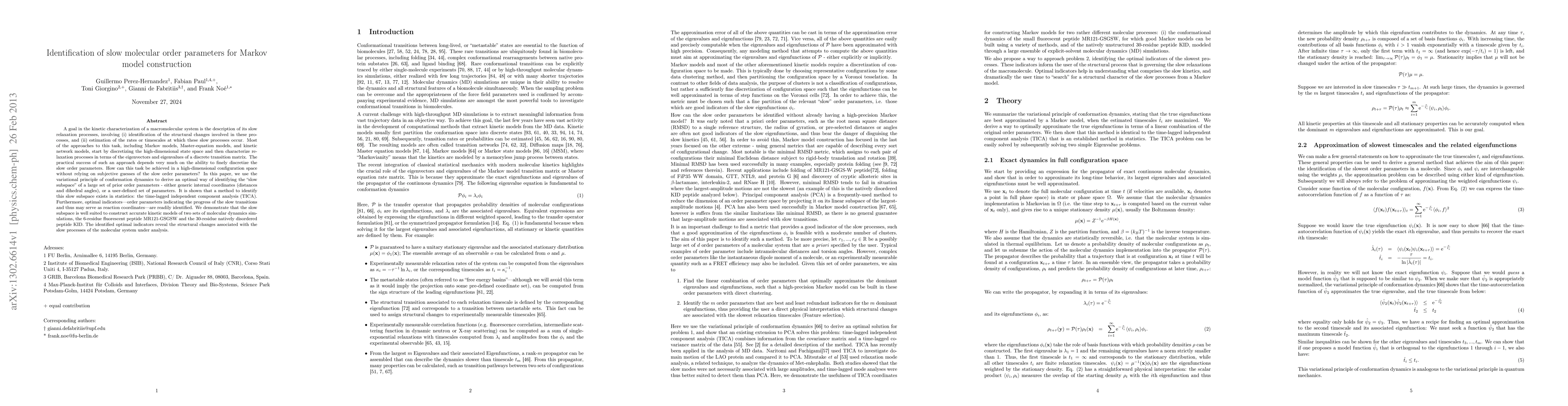A goal in the kinetic characterization of a macromolecular system is the description of its slow relaxation processes, involving (i) identification of the structural changes involved in these processes, and (ii) estimation of the rates or timescales at which these slow processes occur. Most of the approaches to this task, including Markov models, Master-equation models, and kinetic network models, start by discretizing the high-dimensional state space and then characterize relaxation processes in terms of the eigenvectors and eigenvalues of a discrete transition matrix. The practical success of such an approach depends very much on the ability to finely discretize the slow order parameters. How can this task be achieved in a high-dimensional configuration space without relying on subjective guesses of the slow order parameters? In this paper, we use the variational principle of conformation dynamics to derive an optimal way of identifying the "slow subspace" of a large set of prior order parameters - either generic internal coordinates (distances and dihedral angles), or a user-defined set of parameters. It is shown that a method to identify this slow subspace exists in statistics: the time-lagged independent component analysis (TICA). Furthermore, optimal indicators-order parameters indicating the progress of the slow transitions and thus may serve as reaction coordinates-are readily identified. We demonstrate that the slow subspace is well suited to construct accurate kinetic models of two sets of molecular dynamics simulations, the 6-residue fluorescent peptide MR121-GSGSW and the 30-residue natively disordered peptide KID. The identified optimal indicators reveal the structural changes associated with the slow processes of the molecular system under analysis.